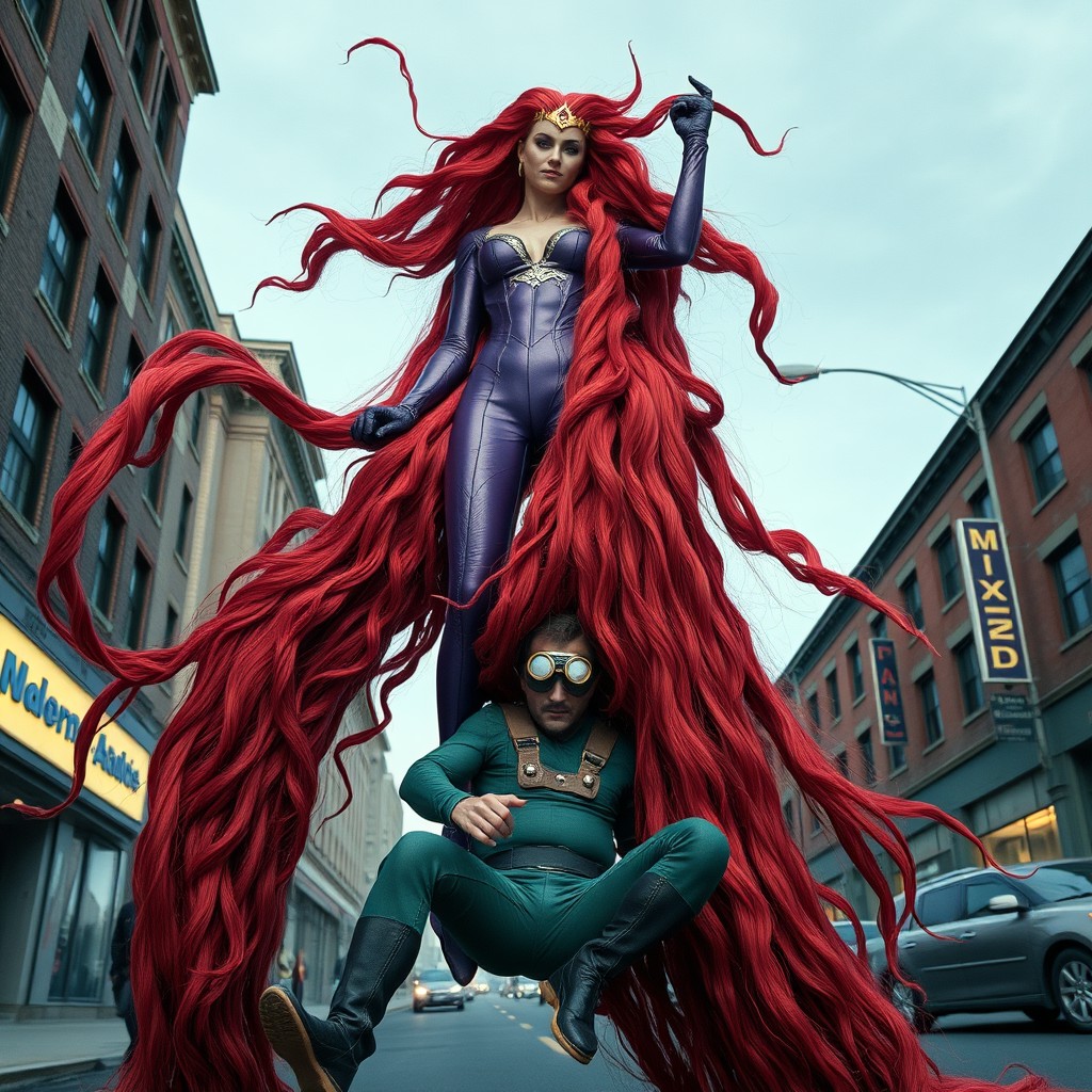 documentary color photograph of Queen Medusa, a stunningly beautiful superhero in purple rising above the street held up by her extremely long thick lush full-bodied red hair reaches all the way down to the ground and extends a for a long ways, a thick column of amazing cascading long locks, the longest hair ever, meters of hair, longer than their feet, it trails beyond her and continues to run incredibly far along the ground and down the street. Her hair has wrapped itself securely around a villain dressed in a green boiler suit and goggles who struggles vainly to free themselves as the hair forces them to the ground