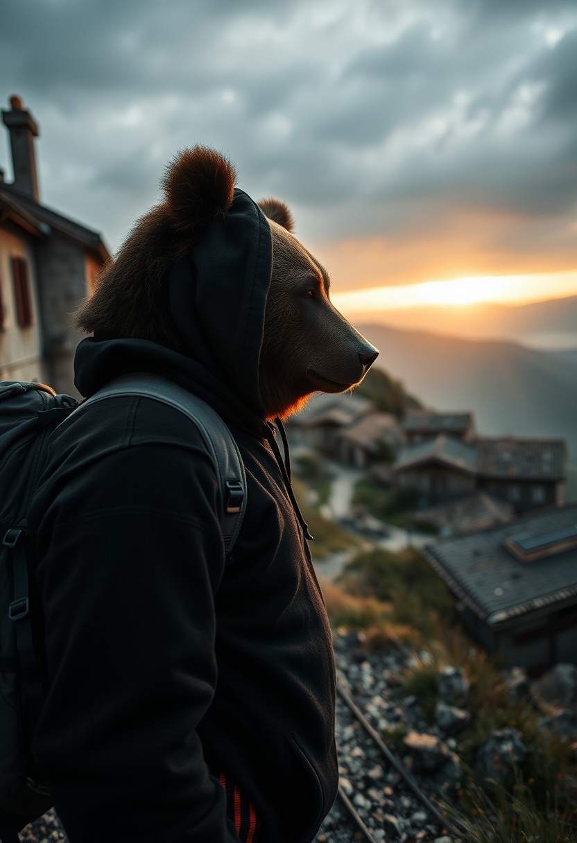 Closeup of an anthro grizzly bear urban explorer wearing a black hoodie walking through an abandoned italian village on a mountainside during early morning. The bear is carrying a backpack with a sleeping bag. The sun is rising and the slightly overcast sky has a tinge of yellow towards the horizon. Highly detailed high contrast photograph with high dynamic range and vibrant shadows and light.