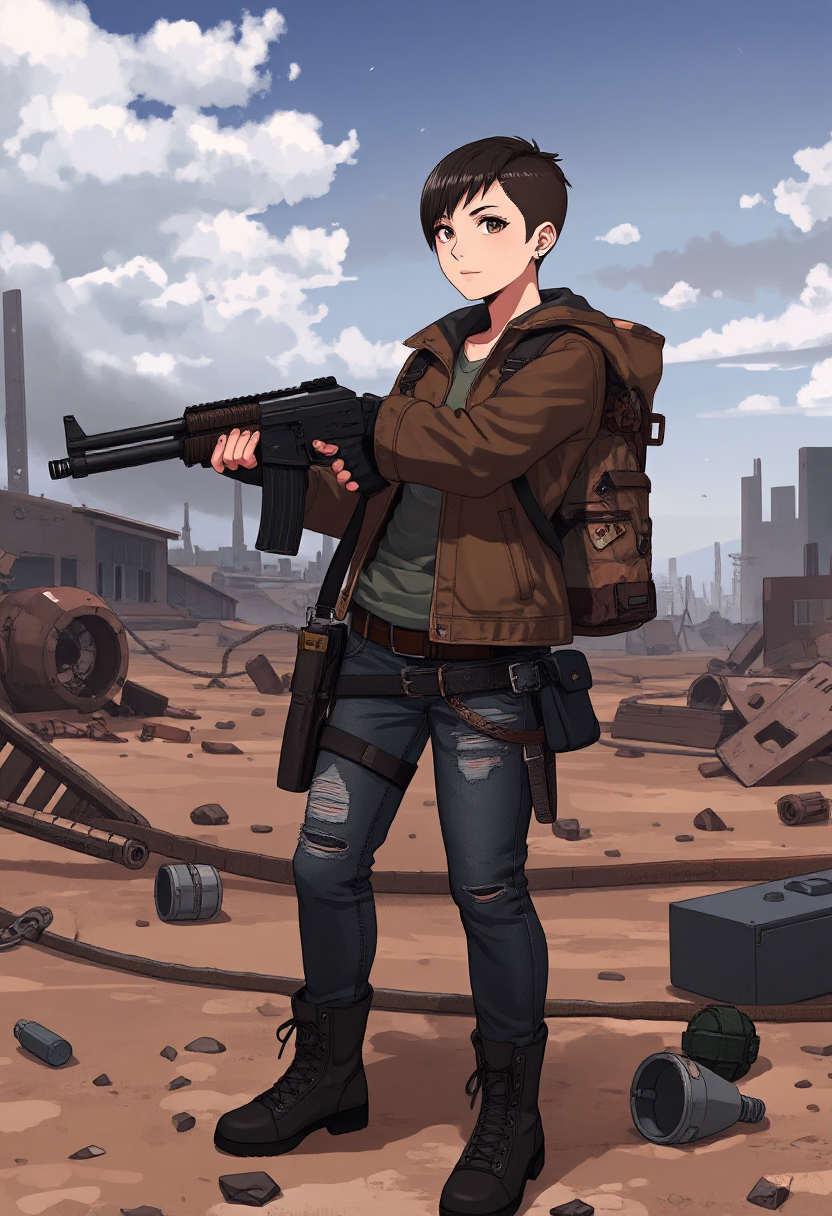 sehele style, fca_style, anime, Post-apocalyptic survivor, centered, wielding a shotgun, 1girl, rugged, short buzzcut that's flecked with gray and brown, weathered leather jacket with metal studs and multiple pockets for scavenged gear. She wears a pair of ripped and faded jeans, along with scuffed up combat boots that have seen their fair share of battles. A desolate wasteland with ruins and rubble scattered everywhere, with the distant hum of engines or machinery echoing through the air.