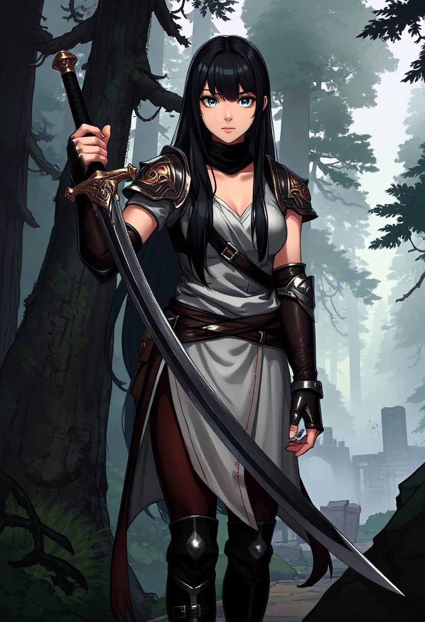 sehele style, fca_style, anime, Fantasy warrior, manga-inspired, centered, holding a curved sword, 1woman, athletic, strong facial features, long black hair that falls down her back like a waterfall, piercing blue eyes that seem to see right through you, leather armor that is worn but still intact, with intricate golden accents on the shoulders and chest. She wears a sleeveless white linen shirt underneath, tied at the waist with a thin black sash. Her pants are dark brown leather, tucked into knee-high black boots with silver buckles. A dense forest with towering trees and a misty atmosphere, with hints of ancient ruins in the distance.