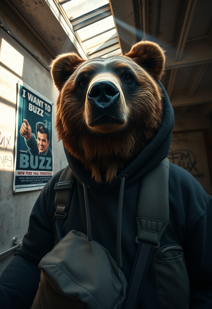 Closeup of an anthro grizzly bear urban explorer wearing a black hoodie exploring an abandoned library around noon. The bear is carrying a backpack with a sleeping bag. On the wall there is a propaganda poster titled "I WANT YOUR BUZZ". In the background there is a spray painted "FLUX" logo on a wall. The air is dusty and rays of light can be seen shining from the ceiling windows. Highly detailed high contrast photograph with high dynamic range and vibrant shadows and light.