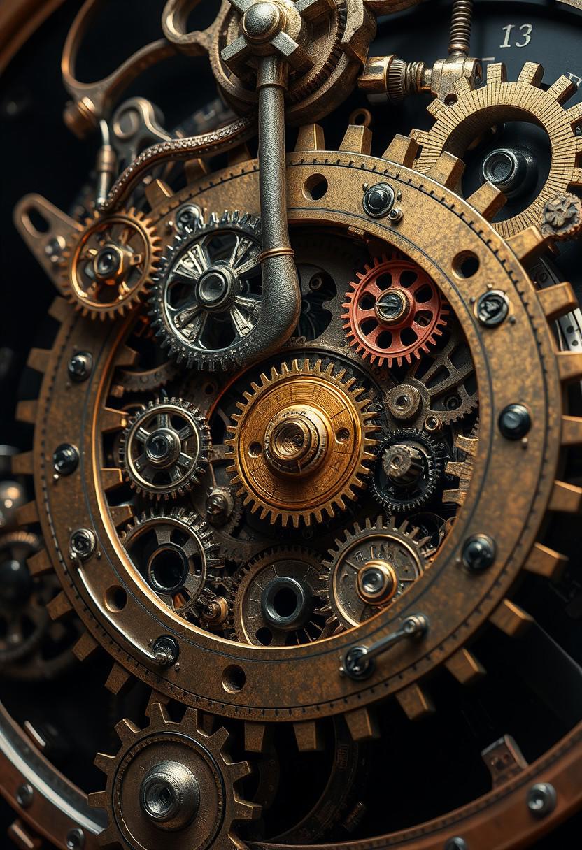 abstract picture of something unimaginable from distant space, cosmic technology delicate clockwork mechanisms that showing the past and the future, intricate wiring and piping clock-core many gears turning, the gears are different shapes and different condition with different materials made, color and detailed texture the holes in gears exposing the inside works of a delicate mechanisms, The gears insides is highly detailed, with realistic features and textures. The background is dark. dramatic lighting, HDR, masterpiece, trending on artstation, smooth, sharp,