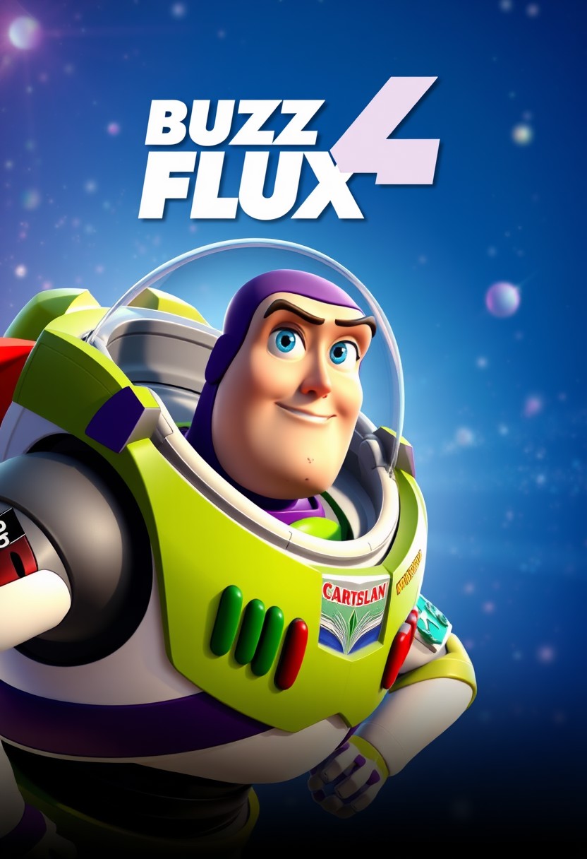 Buzz lightyear character saying "Buzz 4 Flux" as a movie poster, photorealistic, high-quality, highly detailed