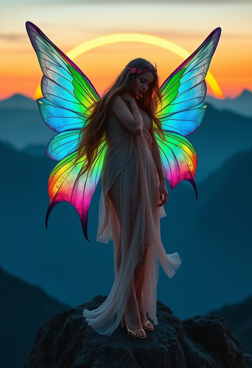 Beautiful Fairy, rainbow wings, on a mountain, cinematic photograph with an orange and blue synthwave crescent moon background.