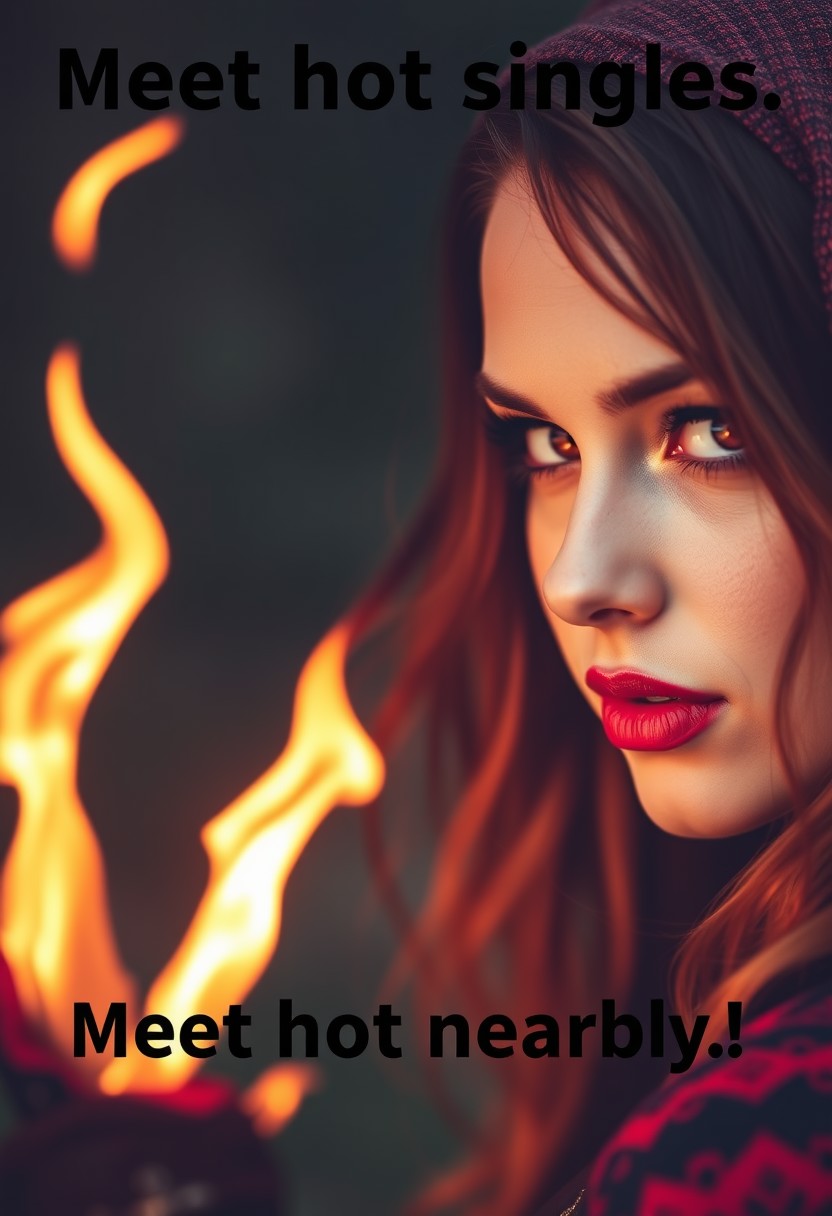 Parody of an online advertising for hot singles nearby. An eye catchy fake ad that features the photograph of a female fire sorceress looking at the viewer with a seducing gaze. Text reads "Meet hot singles nearby!"