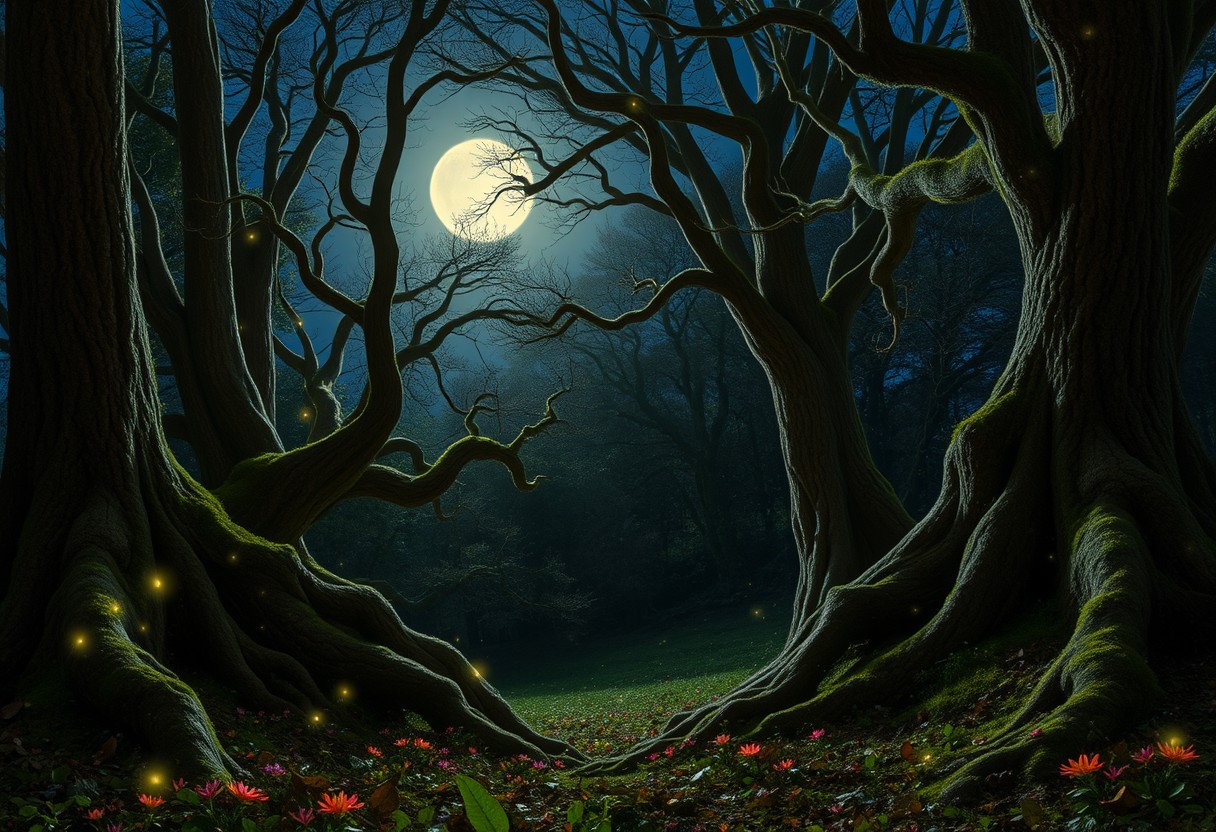 In the quiet embrace of the night, a fairytale forest unfolds, its trees rising like ancient guardians to the sky. Their gnarled branches are draped in a gentle, silvery light emanating from the bright moon high above. Among the moss-covered roots, fireflies dance like tiny, flickering stars, breaking the darkness with their delicate glow. The air is filled with a mysterious whisper, as if nature itself is telling stories from long ago. The ground is adorned with a carpet of wilted leaves and colorful flowers that shimmer mysteriously in the soft light of the fireflies. Here, in this enchanted realm, time seems to stand still. Every corner of the forest holds a secret, and those who look closely might catch a fleeting shadow of a fairy or the gentle smile of a forest nymph. It is a place where dreams come alive and imagination knows no bounds.