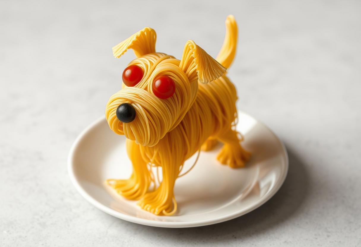 a cute little dog made completely out of spaghetti with eyes made out of tomatoes, standing on a plate