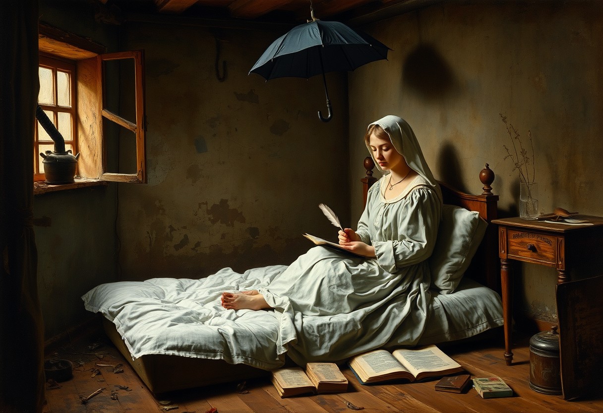 Old Painting in the style of Carl Spitzweg, dark atmosphere, A poor and ill looking young woman in a dirty messy room with a leak in the ceiling and with a little window in the wall on the left an an old iron oven in front of it, sitting in nightgown with a nightcap on a mattress without a bed on the floor under white sheets an pillows, writing in a book with a feather, an open umbrella at the ceiling, books lying in front of the bed, wooden floor, in the style of Carl Spitzwegs the poor poet
