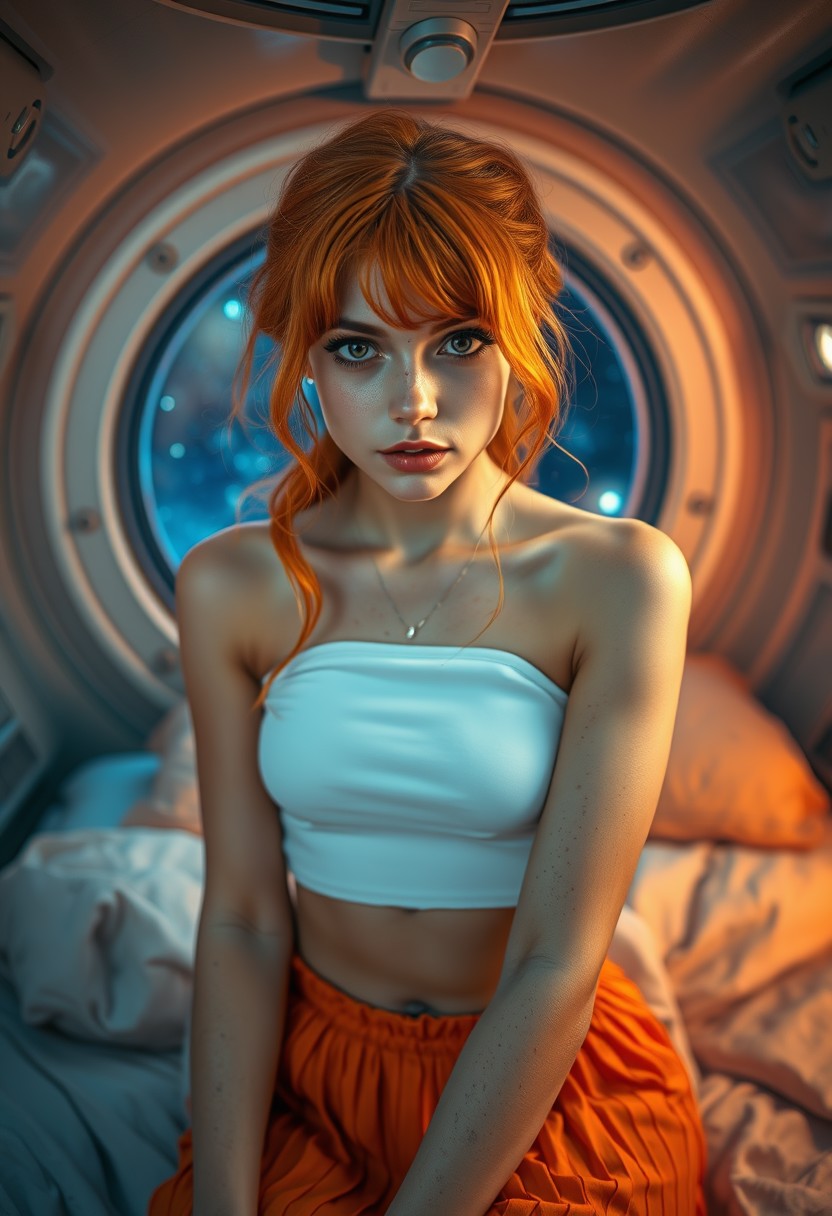 A petite, 21-year-old model with striking orange hair and freckles gazes intensely at the viewer from a futuristic spaceship bedroom. Her big, lustful dark eyes and detailed skin radiate beauty. Dressed in a white crop top and pleated orange skirt, she embodies boho hipster vibes. The scene is illuminated by soft, ambient lighting, with a porthole revealing a starry space backdrop.