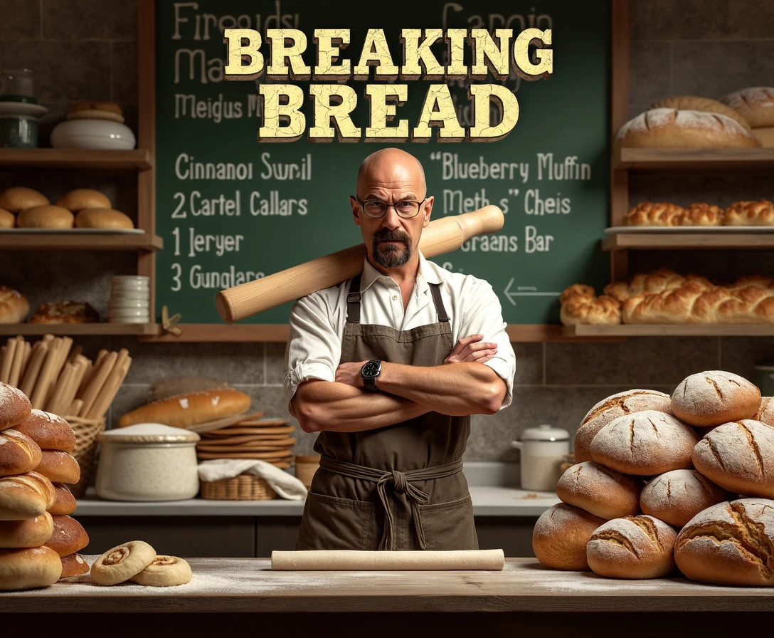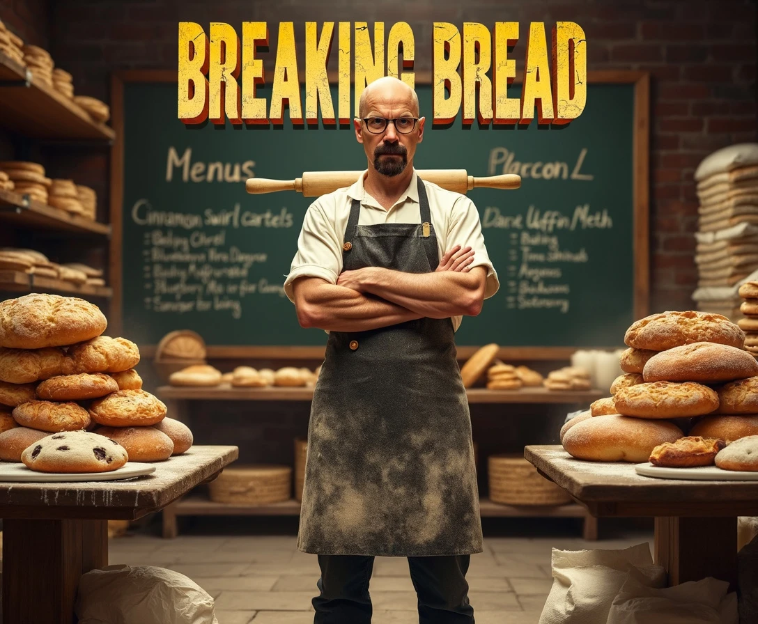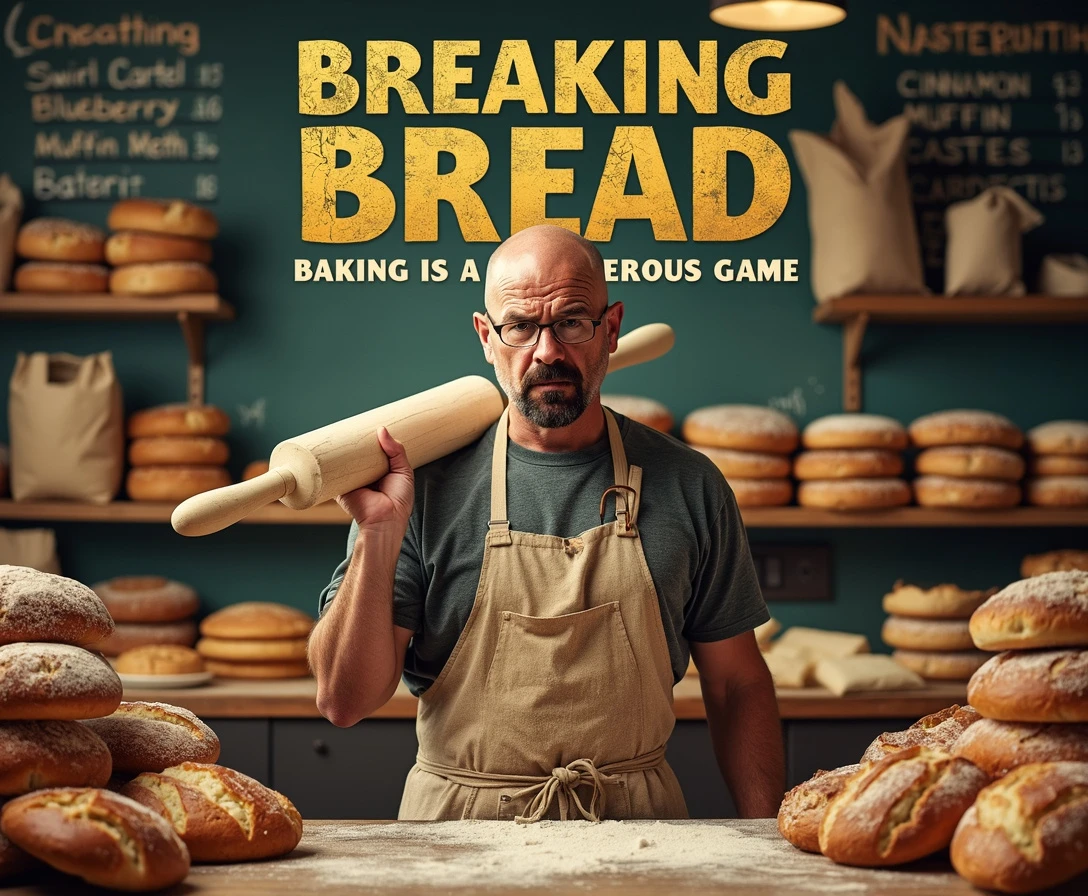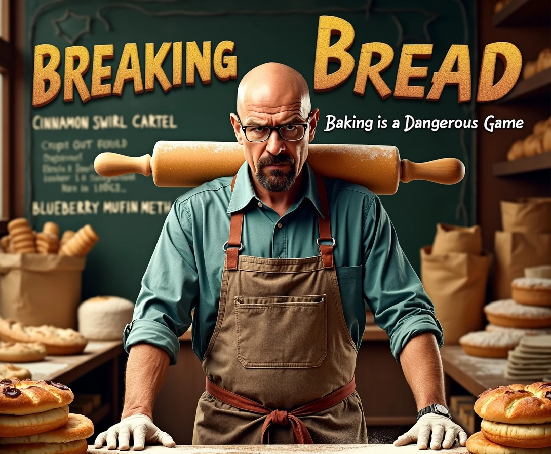 A TV show poster for a parody series titled "Breaking Bread," playing on the name of the famous show Breaking Bad. The poster features a stern-looking baker in a flour-dusted apron, with a rolling pin slung over his shoulder like a weapon. He stands in the middle of a rustic bakery, surrounded by stacks of bread loaves, pastries, and bags of flour, all arranged to mimic the iconic desert backdrop from the original show. Behind him, the bakery's chalkboard menu lists items like "Cinnamon Swirl Cartel" and "Blueberry Muffin Meth," hinting at the culinary chaos that’s about to unfold. The baker’s expression is intense, yet comically serious, as if he's about to take on the world with nothing but his dough and determination. The title "Breaking Bread" is displayed in bold, stylized text at the top, with the "Breaking" in a gritty, cracked font, while "Bread" is written in warm, golden letters resembling freshly baked loaves. The tagline beneath reads, "Baking is a Dangerous Game," adding to the pun-filled humor. The overall color scheme of the poster is a mix of warm, bakery hues with the gritty, dark tones reminiscent of the original show, blending the intense drama of Breaking Bad with the lighthearted, culinary twist of "Breaking Bread."