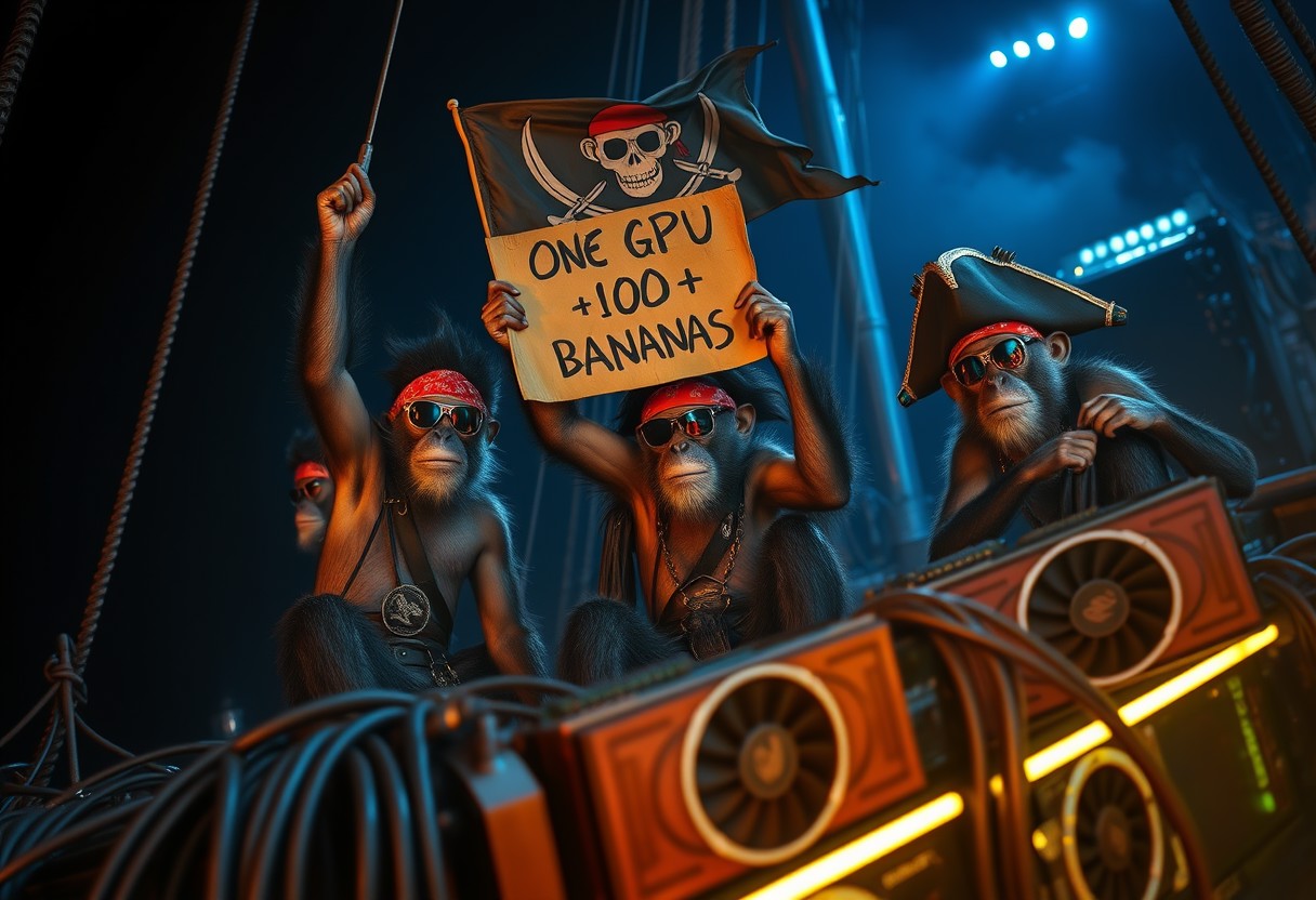 Zoomed in closeup, Hazey cinematic atmosphere, documentary action film, fantasy sci-fi movie, hyperrealistic, fullhd, night, nighttime, dark, Pirate Monkeys wearing sunglasses and bandanas are celebrating a successful raid, one monkey holds up a cardboard saying "One GPU for 100 Bananas", thieves, on a boat, ship, pirate ship, pirate flags, pirate flag with monkey head and sabers, server equipment with many cables and wires, server racks, neon lights, the monkeys are sitting on dancing in celebration hardware trash, neonlamp strips, large graphics cards with many big cooling fans, massive GPUs, treasure