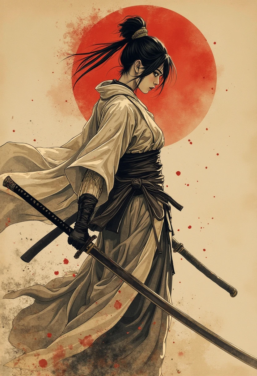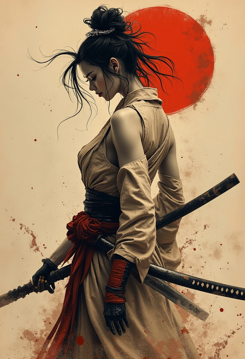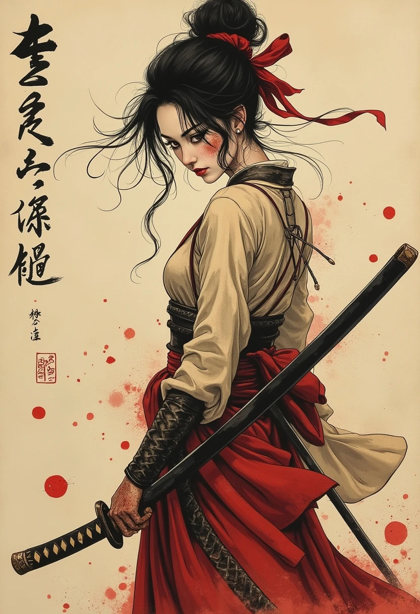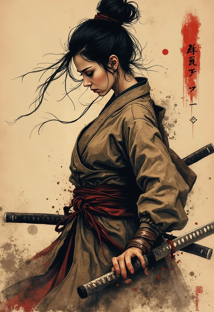 traditional japanese art style, ink on paper, wabi-sabi, henna and carmine, sepia, BREAK, japanese female warrior, holding katana, dramatic pose