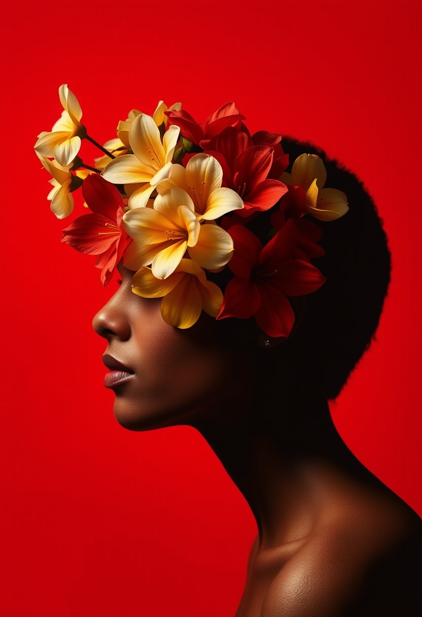 Create an image of a person’s profile against a solid red background. The person’s head is adorned with flowers, creating a contrast between the natural elements and the bold, monochromatic backdrop. The face is intentionally obscured to draw focus to the composition and the interplay of color and form. Their eyes are shadowed. Harmonious artistic color schemes are present.