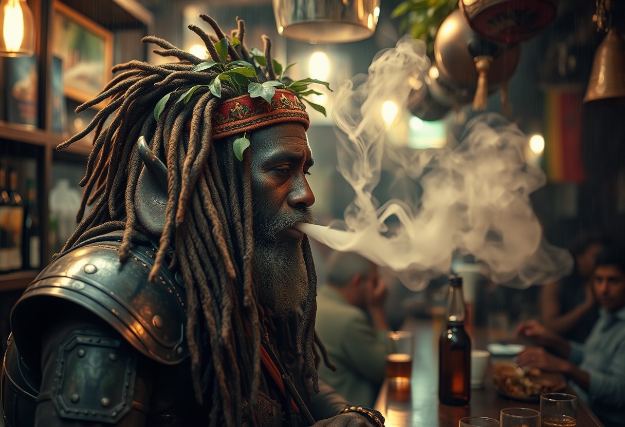 ( shot on a iPhone style) chilled happy big dreads tribal painted medicine man Rasta man with armor and military fatigues smoking a huge spliff the size of a bat, he blows of so much smoke it makes the crowd cough and dance, blowing the smoke into a cozy bar, crowded happy cozy gritty scifi jungle bar during a heavy rainstorm (masterpiece medium format swirly bokeh hyperrealisitic concept art 8k) masterpiece medium format photo tribal amazon warrior he has leaves and flora in his hair, muted colours, soft focus