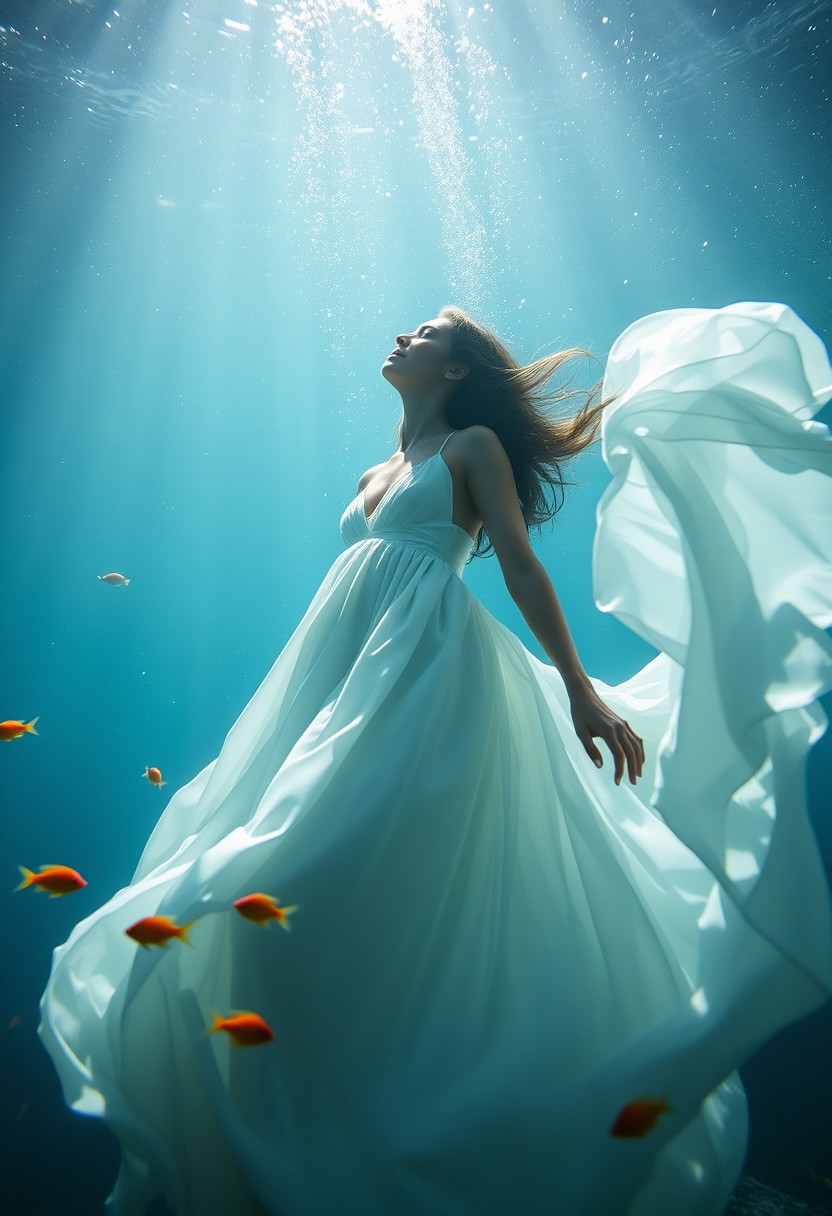 The image depicts a Woman wearing a billowing white dress that floats around her, creating an ethereal effect. The lighting in the image gives it a serene and dreamlike quality, with beams of light filtering through the water, illuminating particles and casting an overall glow on the scene. underwater biome and small orange fishes surround them.