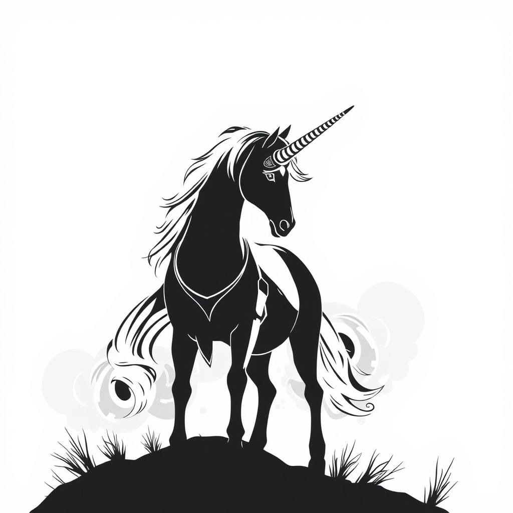 line art drawing . professional, sleek, modern, minimalist, graphic, line art, vector graphics medieval Unicorn - Mythical horse-like creature with a single spiraling horn on its forehead, often symbolizing purity and grace. in torn rpg clothes, 1500ad gracious Cliff violent weather Etienne Maurice Falconet, Bart Sears, Kawacy Silhouette Art . high contrast, well defined, Silhouette Art