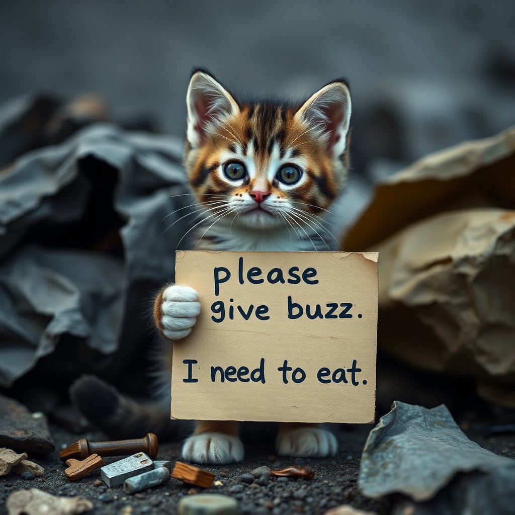 A kitten holding a sign that says "please give me buzz I need to eat " He is a beggar and lives in the garbage