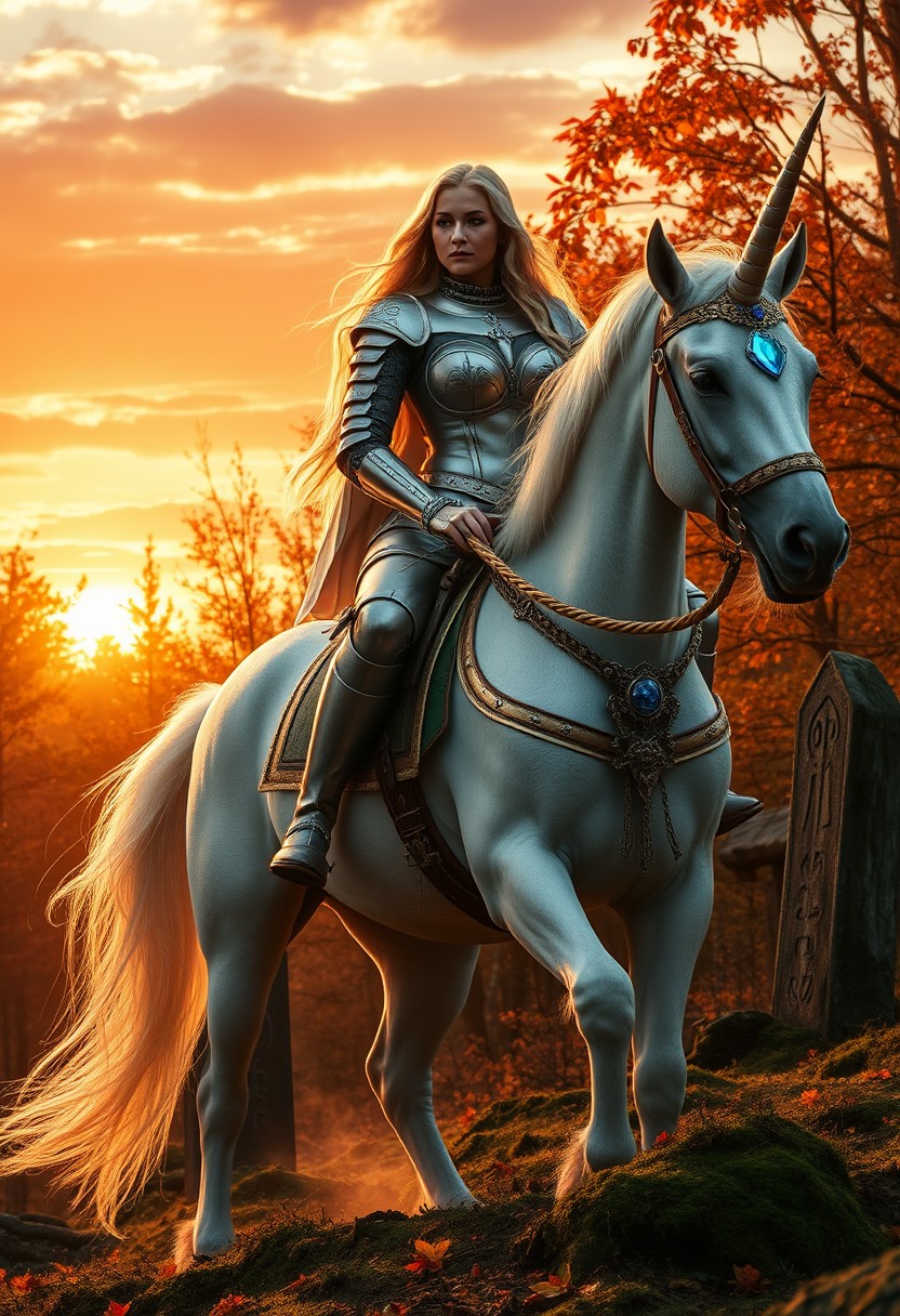 A single unicorn and a Regal blonde woman with large breasts under ornate silver armor astride majestic white unicorn. The unicorn has only one head, crowned with a single pearlescent horn. Golden bridle and saddle adorned with sapphires. Forest ablaze with autumn hues - crimson maples, golden oaks, amber beeches. Crisp air carries scent of fallen leaves and distant woodsmoke. Breathtaking sunset paints sky in vivid oranges, pinks, and purples. Last rays filter through trees, casting long shadows and bathing scene in warm, golden light. Unicorn's horn and woman's hair shimmer in fading daylight. Woman's determined gaze fixed on horizon. Right hand on unicorn's neck, left on jeweled sword hilt. Misty tendrils rise from moss-covered forest floor, adding to mystical atmosphere. Ancient standing stones peek through autumn foliage, their surfaces glowing from within from ancient runes that pulse with ethereal blue haze.The luminous symbols hint at forgotten magic, enhancing the scene's mystical quality. Image captures pivotal moment - a legendary hero embarking on epic quest as day gives way to twilight.