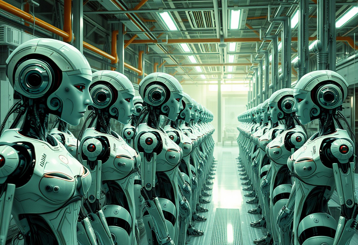 scifi, futuristic science fiction, view of a robot factory, a group of androids lined up, robots lined up, female sex robots, sexy robots,