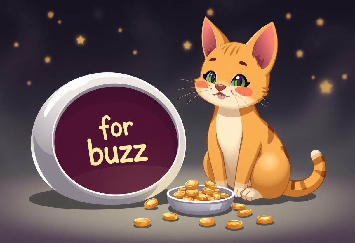 a cute cat sitting near of a empty bowl that says “for buzz". cartoon style magic background gold money and ignot on the ground There's gold at the bottom of the bowl.