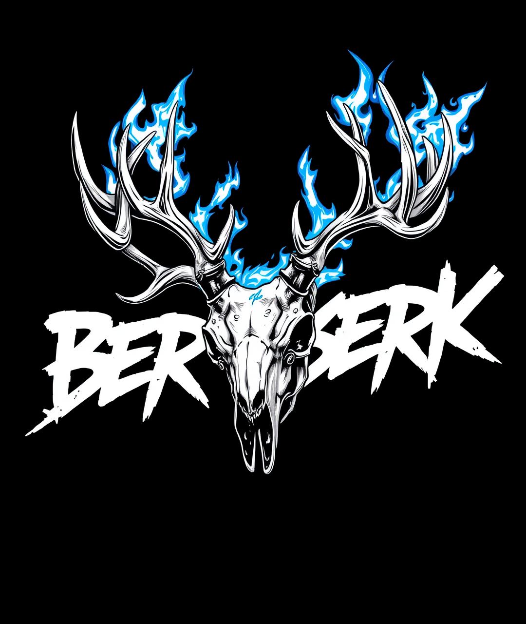 create a brutulist Grunge and dark white highly detailed line art logo on a black background poster,create a heavily exaggerated anime illustration of a brutul deer skull with antlers blazing with blue fire,"BERSERK"graffiti written in the background in bold horror fontstyle, harsh rim lighting,