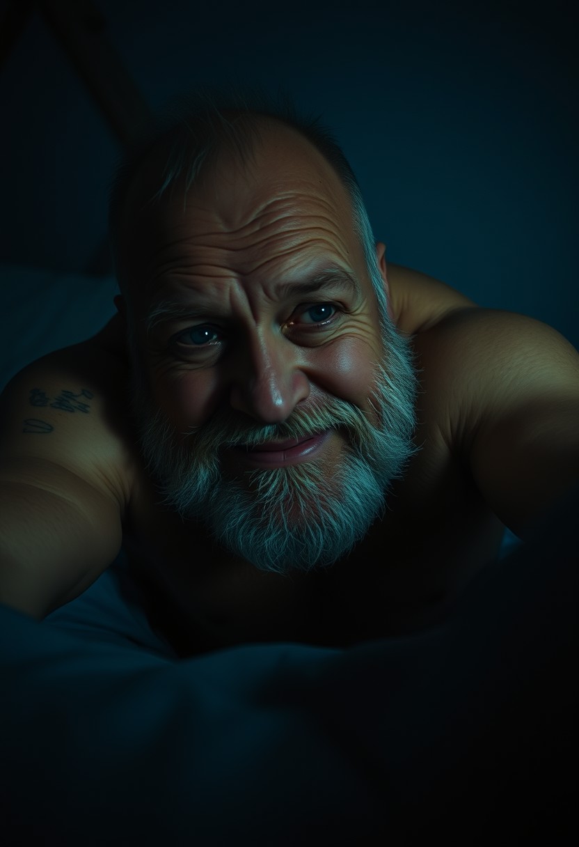 closeup seen from below, Lowlight nighttime mobile camera portrait, Romantic arthouse film showing an intimate scene at night, Alone solo, Lustful pervert gay Sexual tension, vintage erotica photography, old hairy obese tanned grandpa daddybear, looking at viewer with seductive lustful expression, leaning over viewer in bed, dark hallway,looking directly at viewer with a seductive perverted smile, moaning softly, massive muscular steroid biceps, in a dark bedroom at night, lowlight grain, dark blue atmosphere, the man is in the shadows and very dark, blue TV light