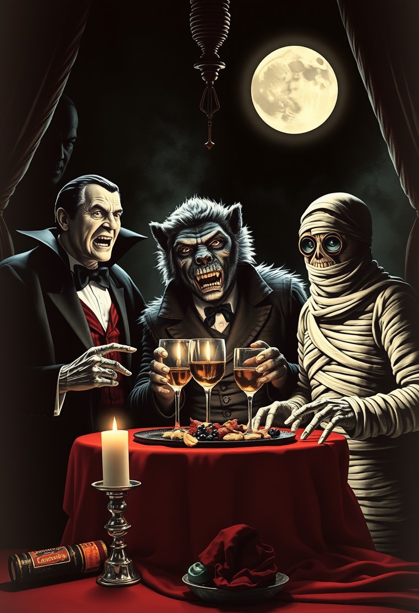 Dracula, The Wolfman and the Mummy at the creature from the black lagoon's bachelor party