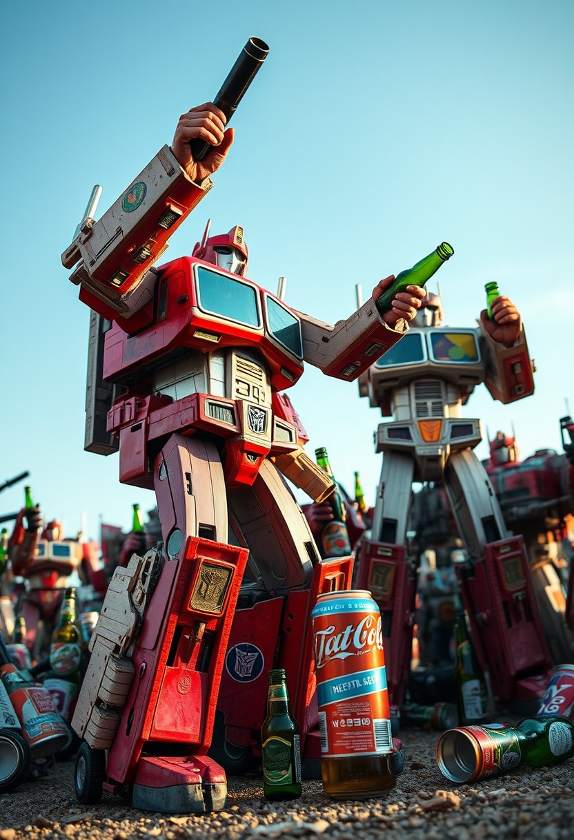 Drunk Transformers, very very drunk, empty beer cans and bottles, wasted.