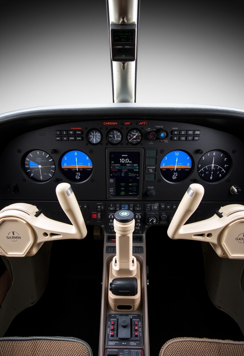 A beautifully composed professional photograph of a Cessna 172 instrument panel after a full Garmin upgrade, GTN750xi ,G5, G1000