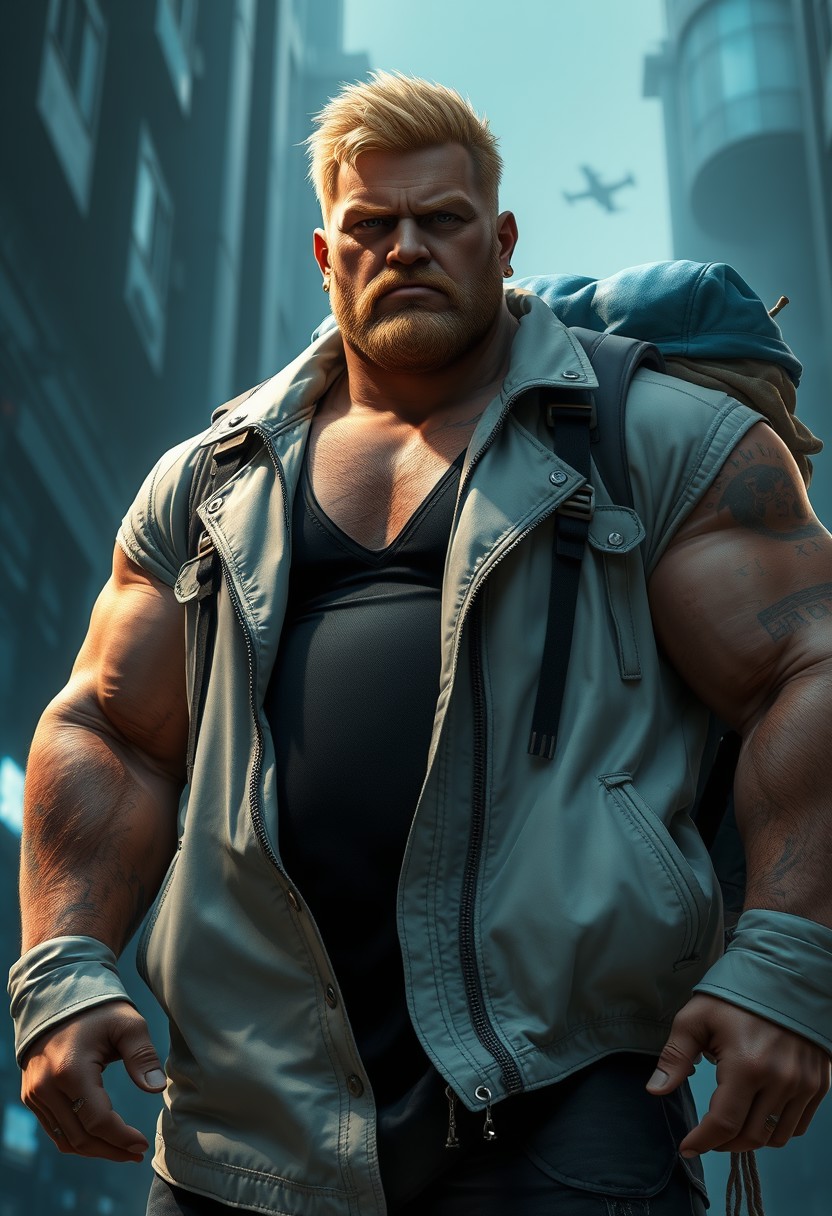 action movie scene with hazey blue colorgrading and noise grain, gay bara manga by Goh Fujimoto and Gengoroh Tagame as hyperealistic dark cgi scifi movie 3d 2.5d render with realistic professional lightning and advanced 3D shading tech, depicting a serious stern blonde hairy german musclechub wiith a big round belly and huge steroid muscle arms wearing a white leather jacket and long loose black v-neck tshirt , small golden earring in right ear, very hairy chest, his face is round and he has crooked small nose and a doublechin, in a dark megastructure megacity, hands in jacket pockets while having an epic main protagonist pose with a fitting dramatic camera angle, wearing a huge teal colored adventurer backpack with strands of cloth hanging from it, detailed high resolution textures, dark shadown with dynamic rimlight