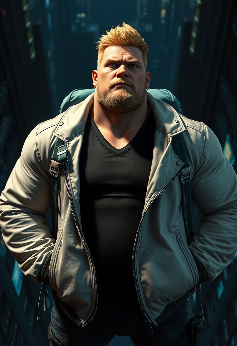closeup character portrait from above, gay bara manga by Goh Fujimoto and Gengoroh Tagame as hyperealistic dark cgi scifi movie 3d 2.5d render with realistic professional lightning and advanced 3D shading tech, depicting a serious stern blonde hairy german musclechub wiith a big round belly and huge steroid muscle arms wearing a white leather jacket and black v-neck tshirt , small golden earring in right ear, very hairy chest, his face is round and he has crooked small nose and a doublechin, in a dark megastructure megacity, hands in jacket pockets while having an epic main protagonist pose with a fitting dramatic camera angle, wearing a huge teal colored adventurer backpack with strands of cloth hanging from it, detailed high resolution textures, dark shadown with dynamic rimlight