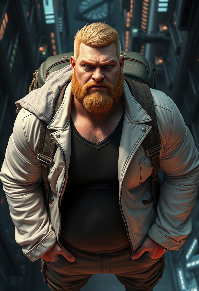 closeup character portrait from above, gay bara manga by Goh Fujimoto and Gengoroh Tagame as hyperealistic dark cgi scifi movie 3d 2.5d render with realistic professional lightning and advanced 3D shading tech, depicting a serious stern blonde hairy german musclechub wiith a big round belly and huge steroid muscle arms wearing a white leather jacket and black v-neck tshirt , small golden earring in right ear, very hairy chest, his face is round and he has crooked small nose and a doublechin, in a dark megastructure megacity, hands in jacket pockets while having an epic main protagonist pose with a fitting dramatic camera angle, wearing a huge teal colored adventurer backpack with strands of cloth hanging from it, detailed high resolution textures, dark shadown with dynamic rimlight