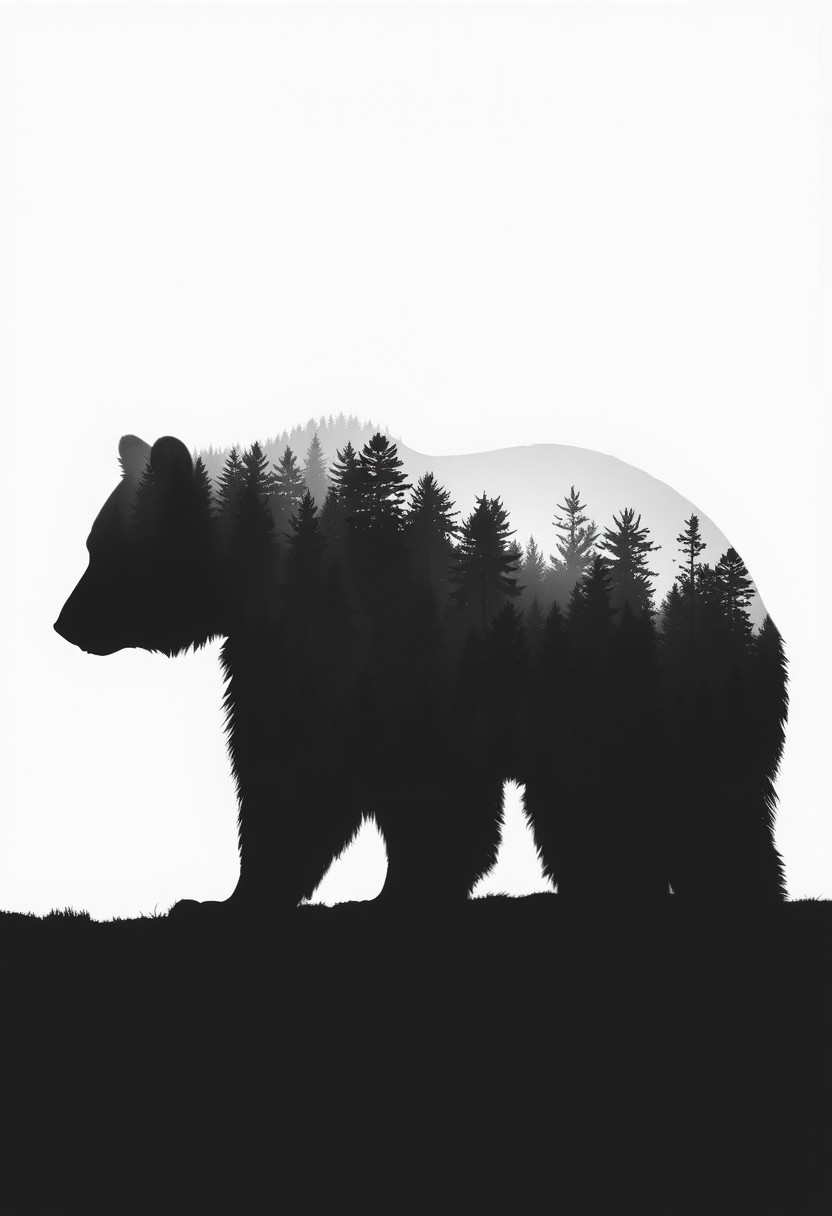 Silhouette of a grizzly bear filled with a forest, double exposure, crisp lines, monochrome background