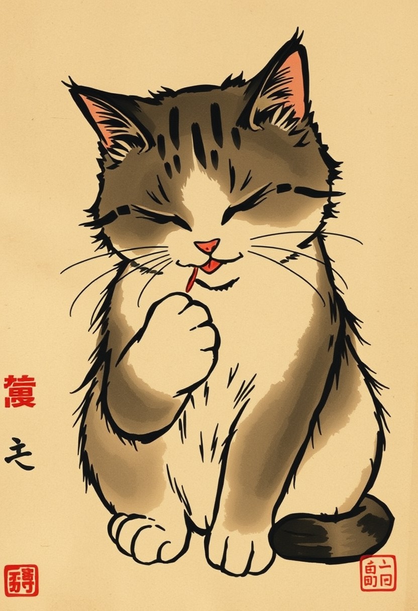 traditional japanese art style, ink on paper, wabi-sabi, henna and carmine, sepia, BREAK, cute, japanese cat, dramatic pose, licking its paw