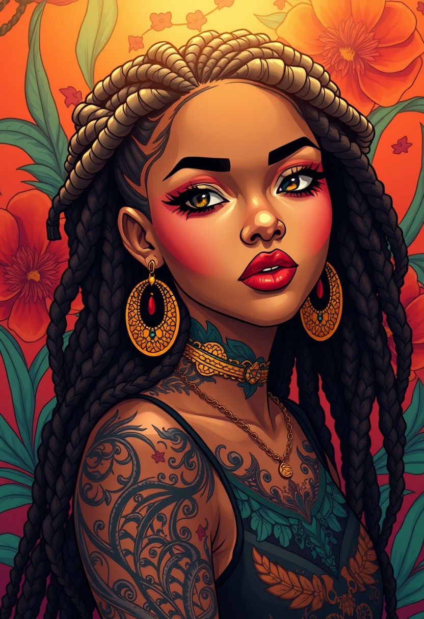 illustrated pretty (biracial) ((dreadlocks)) girl with tattoo vibes , featured in an illustration that is intricate, Detailed, and elegant, the artwork captures her in a vibrant and highly stylized environment, with smooth and sharp focus, showcasing the cutting-edge fashion trends, the lighting is dramatic, emphasizing the dynamic elements and creating a sense of wonder, illustrated by artists known for their bold and innovative styles, such as artgerm, Greg Rutkowski, and alphonse mucha.