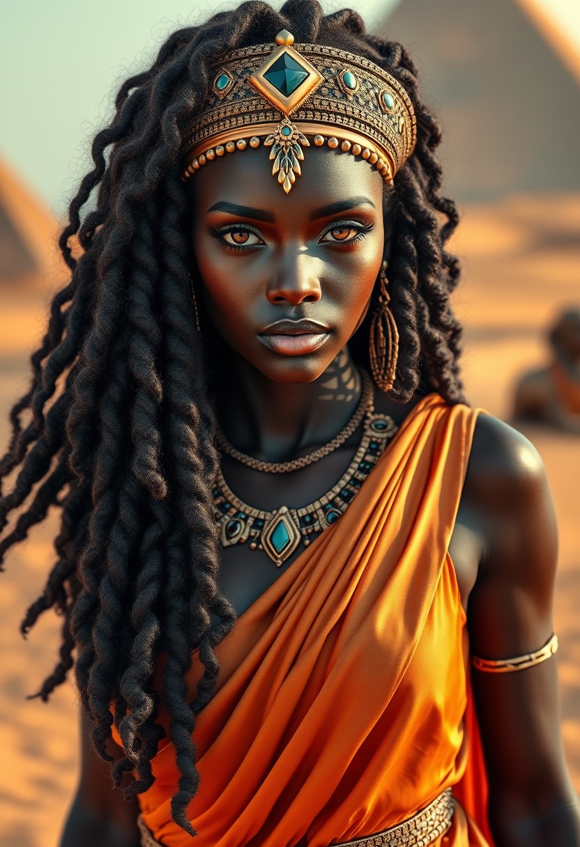 Photography, black woman pharaoh Cleopatra, richly dressed in silks, walking on desert sand, jewelry design,bernini, macro lens, ancient egyptian,sphinx, black woman, desert background, hazel eyes, ultra realistic and detailed, reflection eyes ultra realistic, skin perfect, with vibrant meticulously detailed intricate long curly glowing and flowing hair, Fantasy, Beautifully lit, Beautiful lighting, lovely colors, Intricate details, fineart, max details, Ultra realistic, photo realism, Perfect anatomy, precise features, ((boobs)), (((thick hips))), ((dreadlocks))