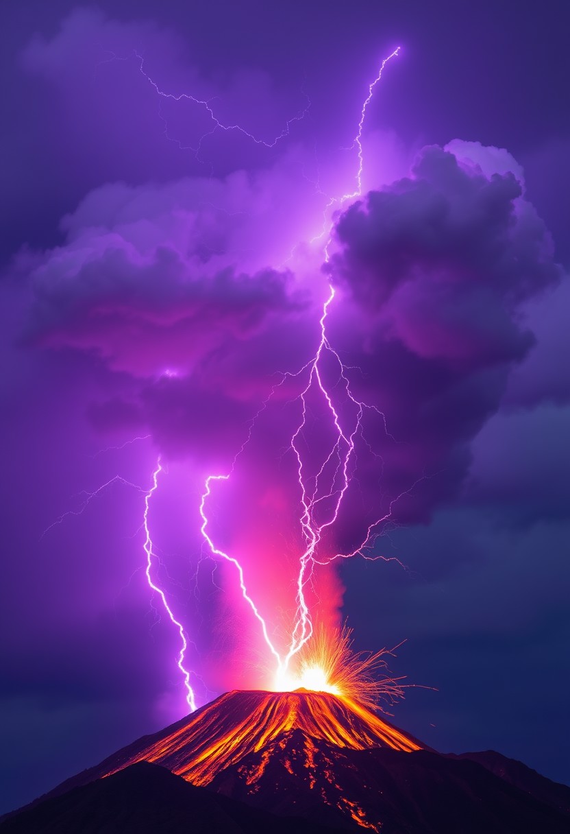 purple lightning over an erupting volcano, lightning strikes in the clouds of soot of the volcano
