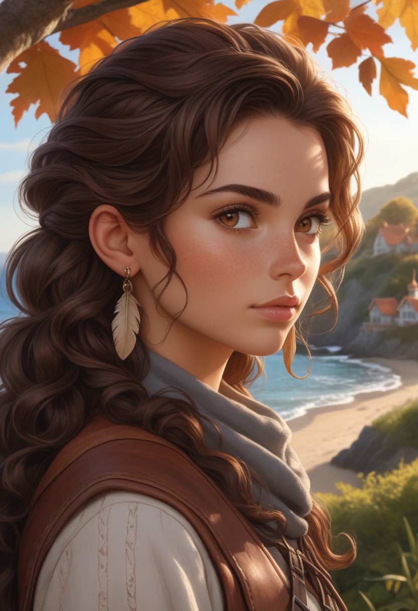 (photorealism:1.5) female adventurer, curly brown hair, thoughtful expression, gazing at the majestic tree, falling leaves, (feather earring), calm coastal village in the background, warm sunlight, vibrant colors, high contrast, hyper-realistic, serene atmosphere, pensive pose, detailed, high-definition, reflective mood, peaceful setting slight freckles, long eyelashes, thick eyebrows,