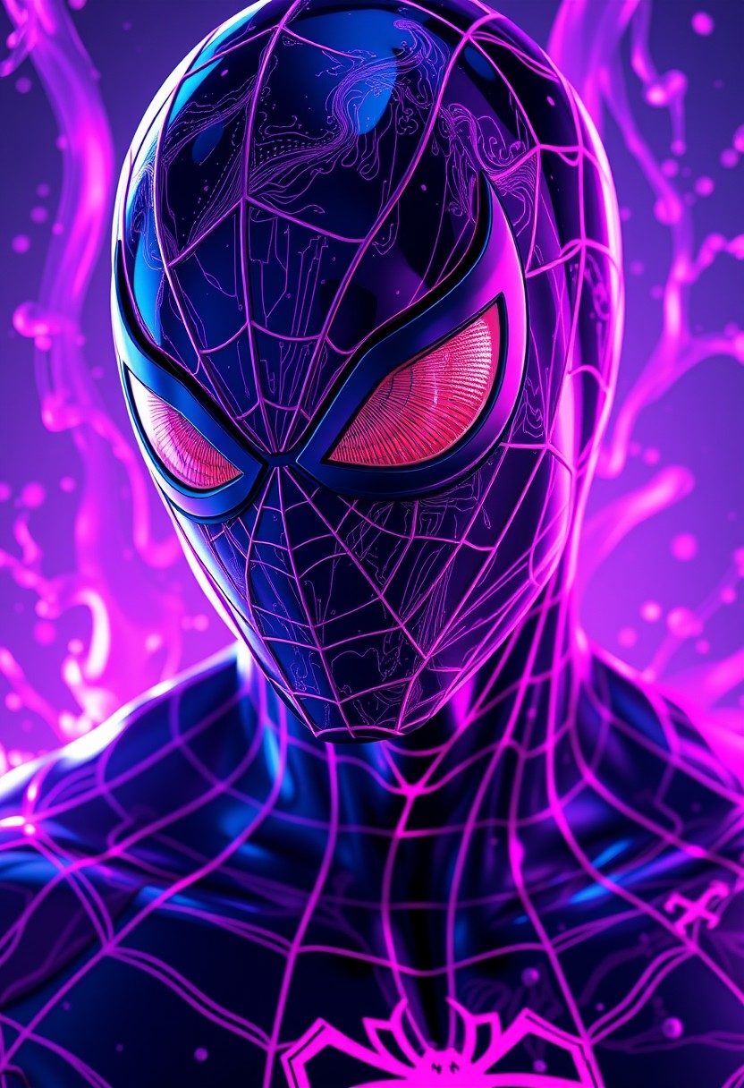 Liquid Neon' style of Spider-Man, where neon lights flow like liquid, creating vibrant patterns of Purple and pink, head and shoulders portrait, 8k resolution concept art portrait by Greg Rutkowski, Artgerm, WLOP, Alphonse Mucha dynamic lighting hyperdetailed intricately detailed Splash art trending on Artstation triadic colors Unreal Engine 5 volumetric lighting، Glossy, wet, ultra realistic