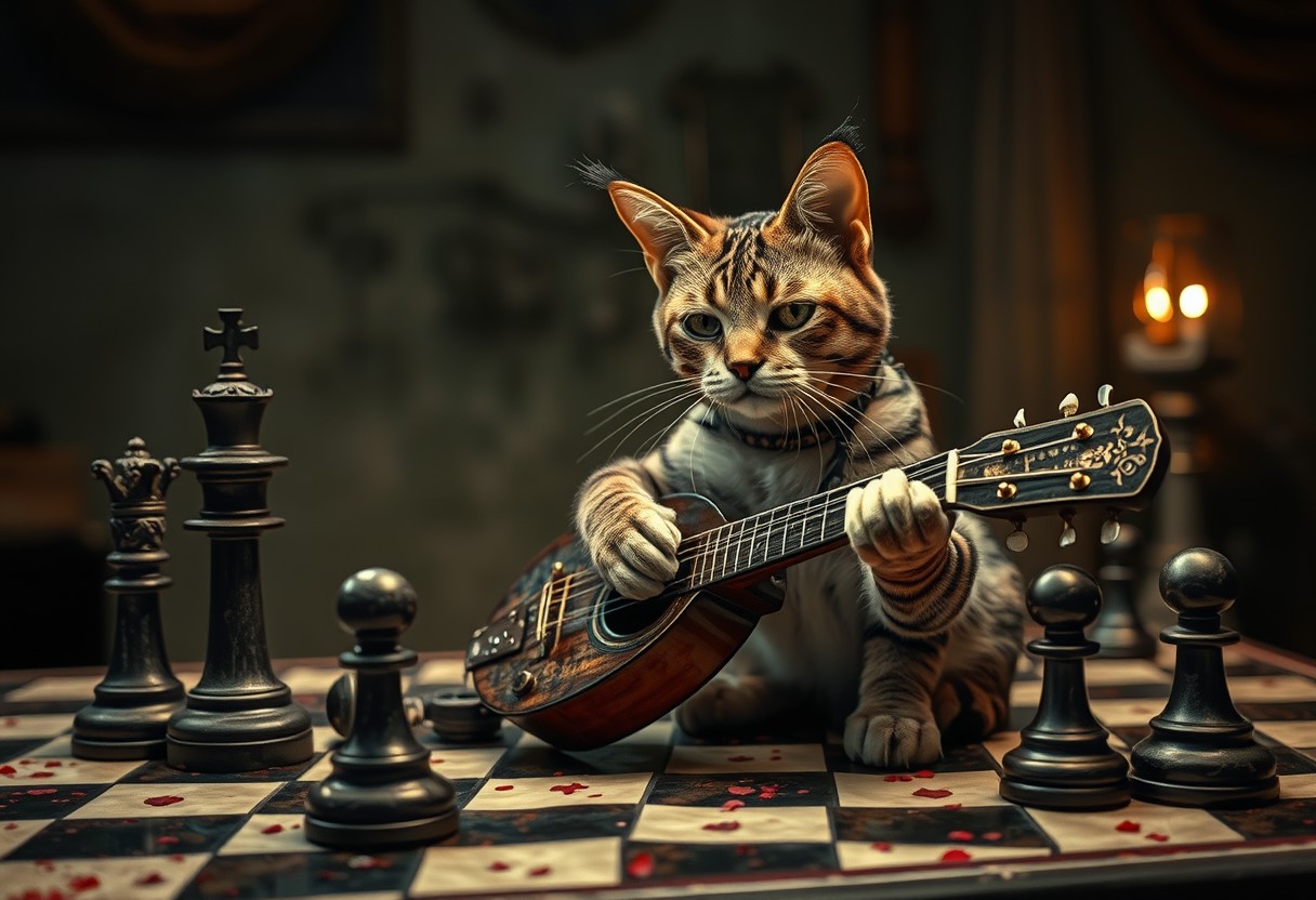 cat from wonderland on a chessboard, horror ambience,italian mood, magnana por la magnana, italian sign, no work from me today, mafia pizza mandolino