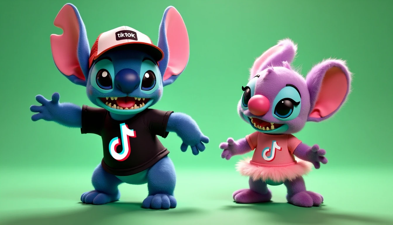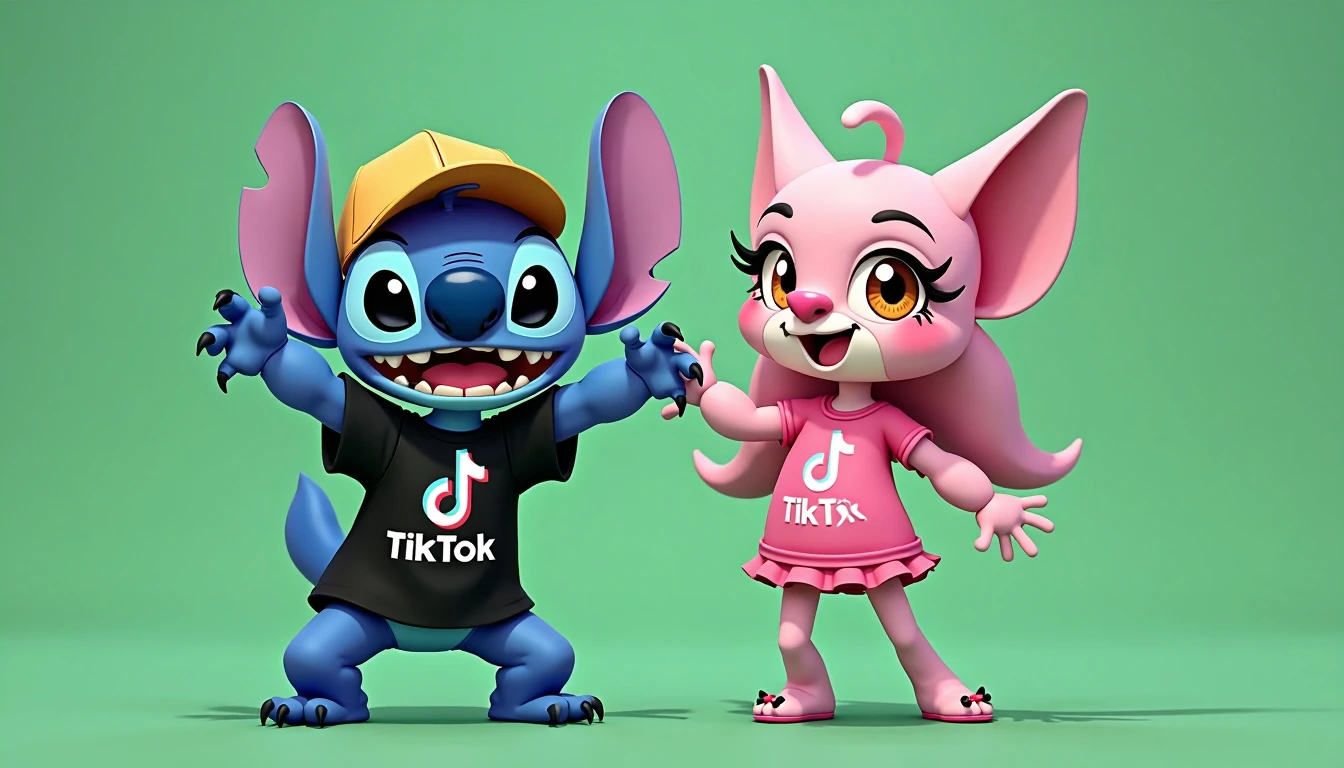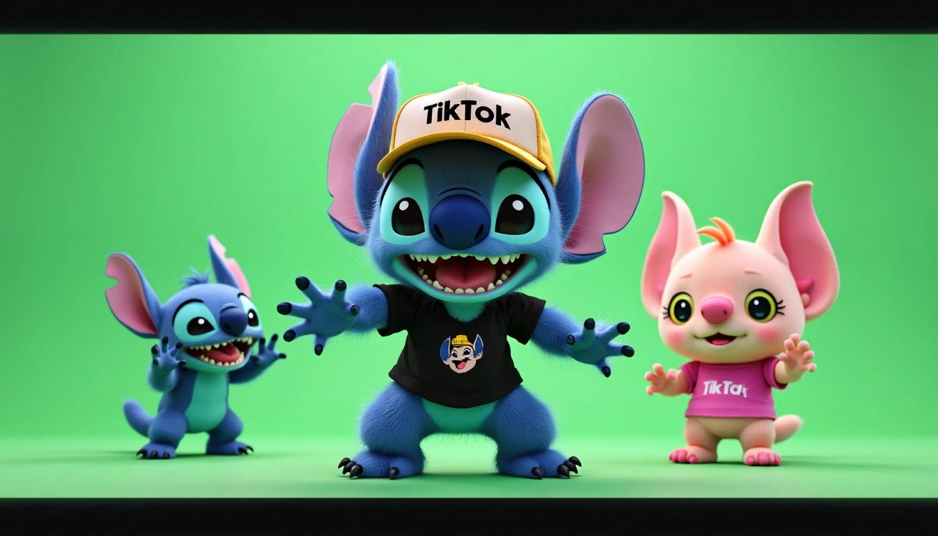 Stitch fluffy 3d Wearing Black t shirt Tiktok branded logo and trucker hat tiktok Full body twerking Accompanied by Stitch Angel Pinkcharacter wearing pink t shirt with tiktok logo Green screen background