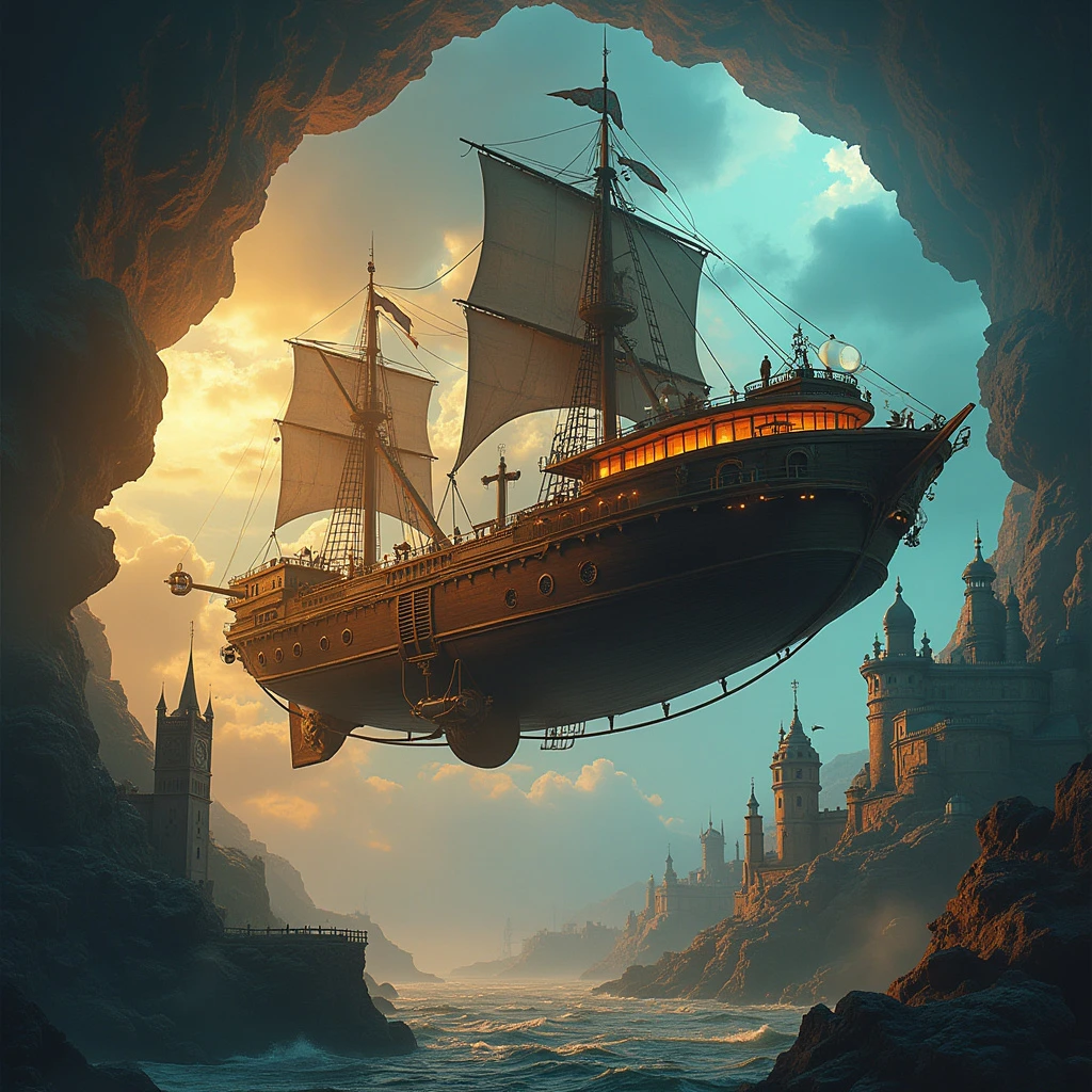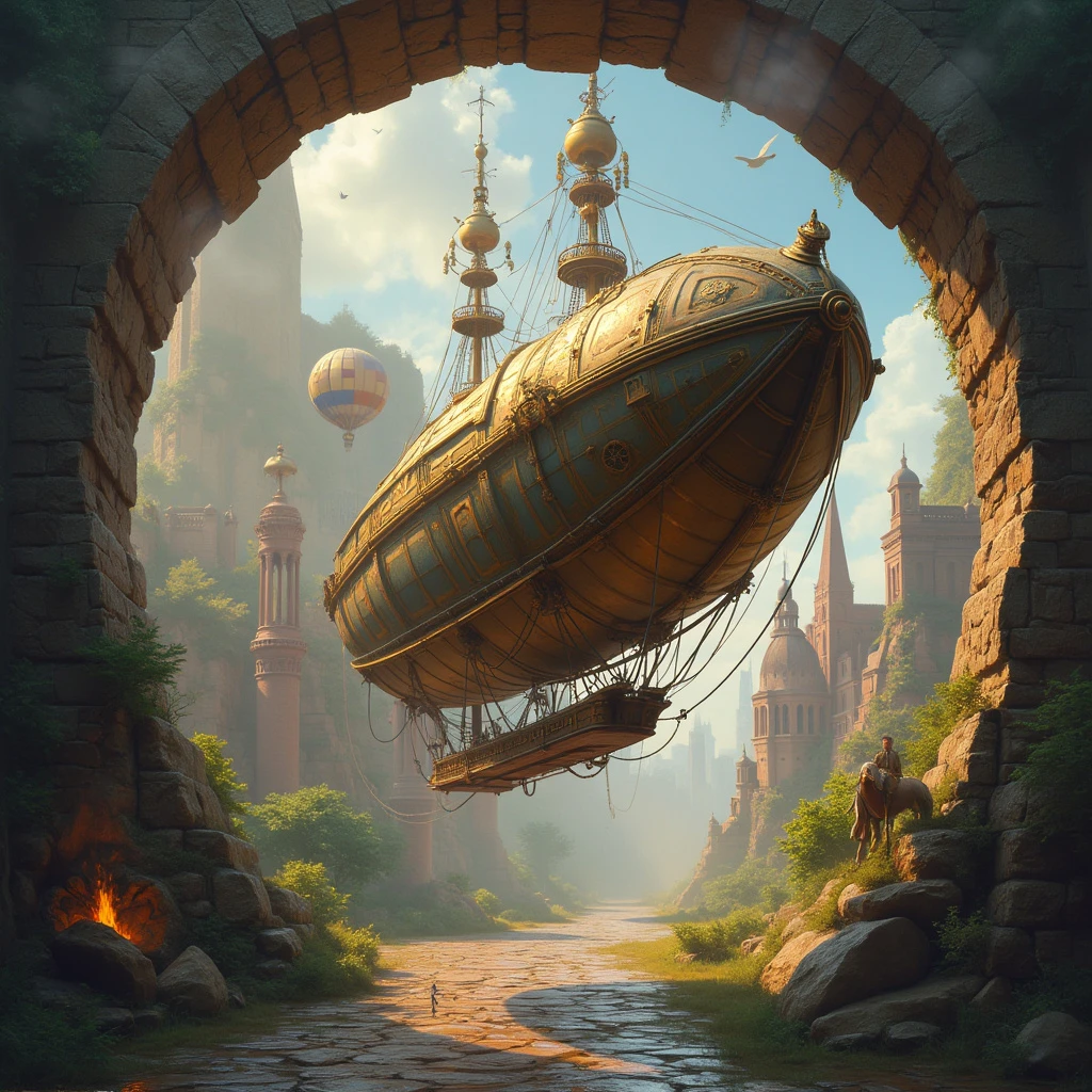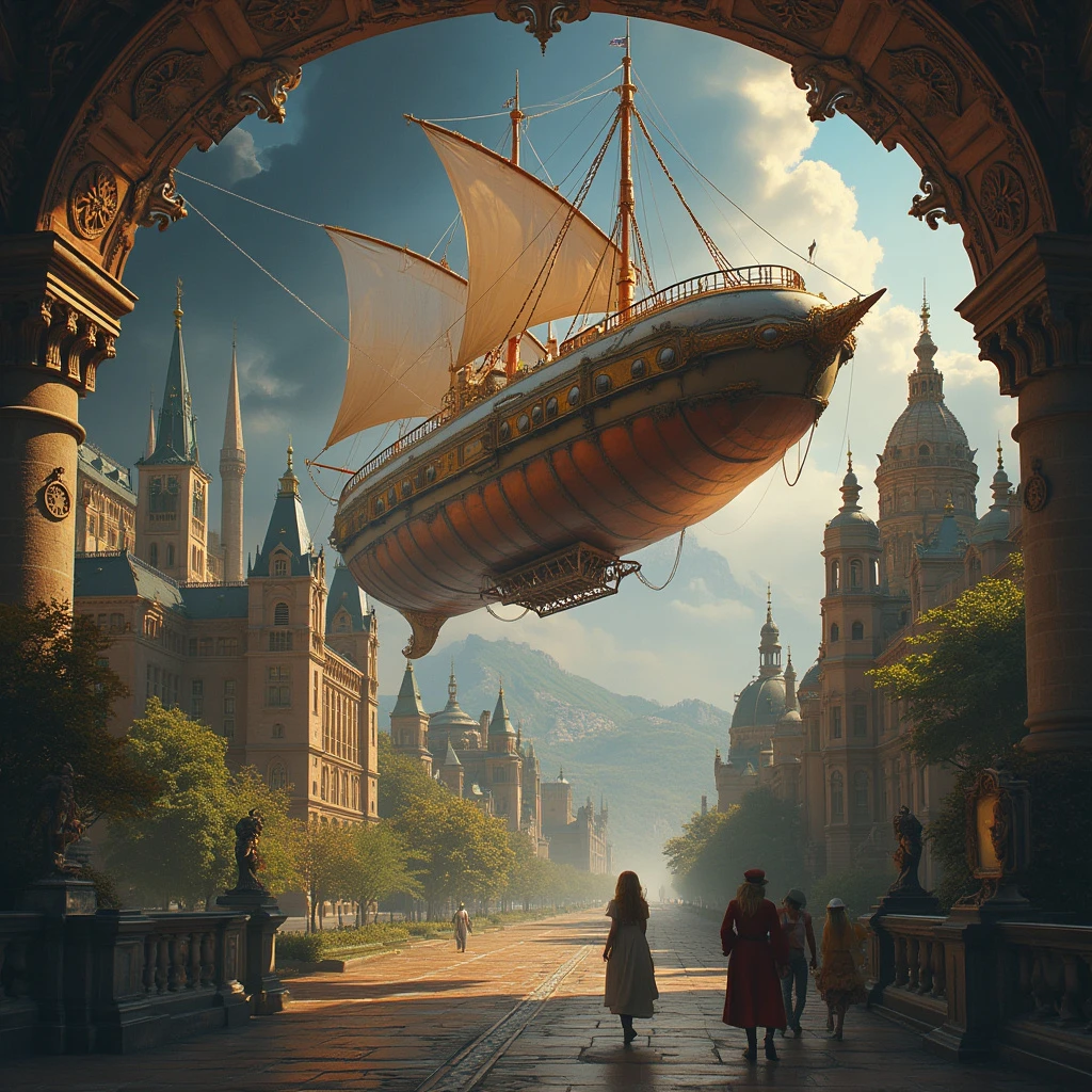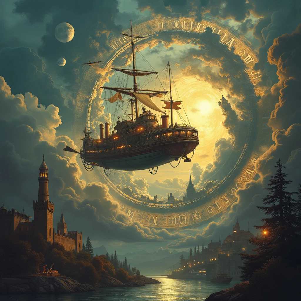 A steampunk airship gliding through a time portal, connecting various historical landmarks. Facebook cover photo."