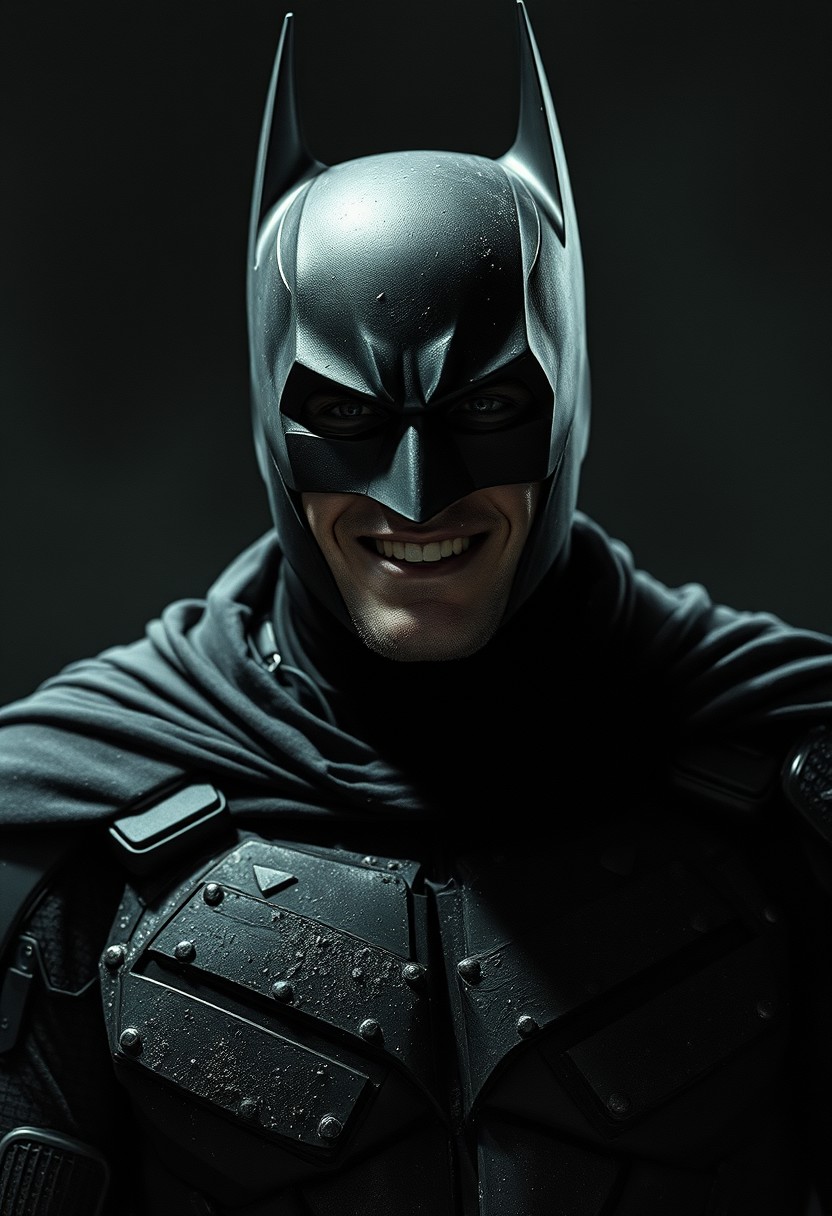 DARK movie still, heavy Film grain, monochrome with Low Key color Highlights, A dystopian DARK villain Photo Portrait of Batman, outworn Cape and armored suit, rough skin, skin Details, he Is Happy, he smiles, outworn, he Is very iconic, in pain, dust, dirt, gritty, Film Noir Style, high contrast, deep blacks, vibrant blue Pop art elements,