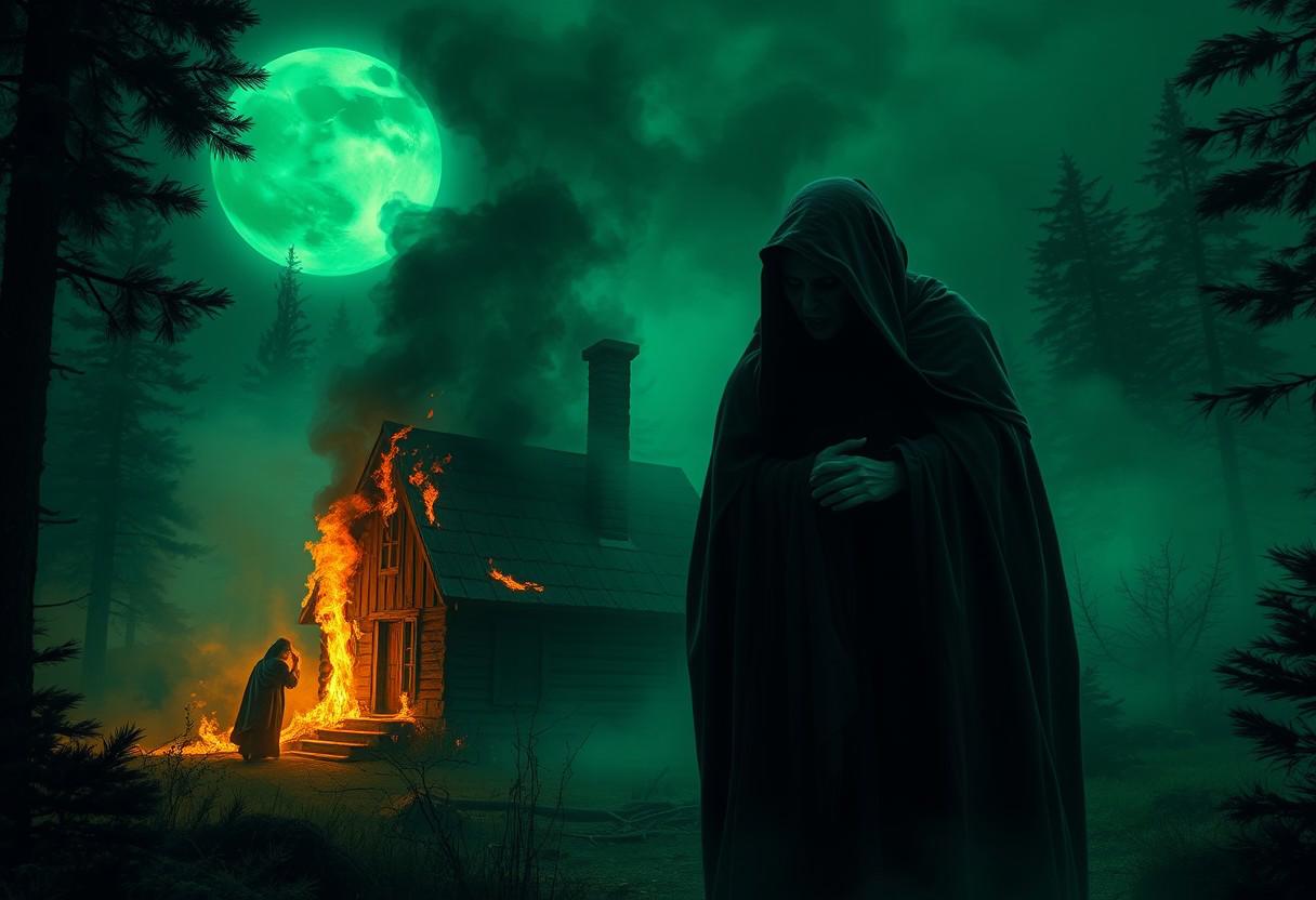 scary old women, diabolic look , with dark faces and small slightly glowing eyes in dark cloaks, gathering around a small House standing in flames, the Heavy smoke of the fire is Green, a lot of smoke, in a dark conifer forest, Green Moon, great lighting