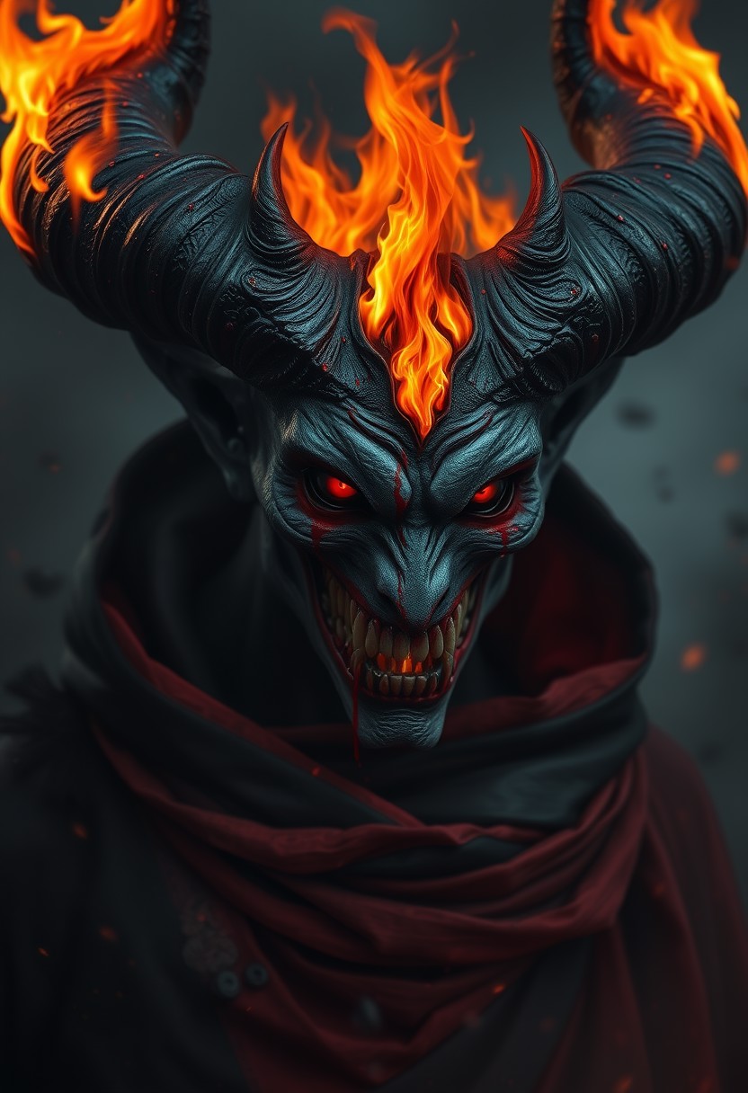 Photorealistic fantasy demon humanoid flames as hair, burning iris, black and red cloack, bloody smile, dark scenery, foggy, ashes