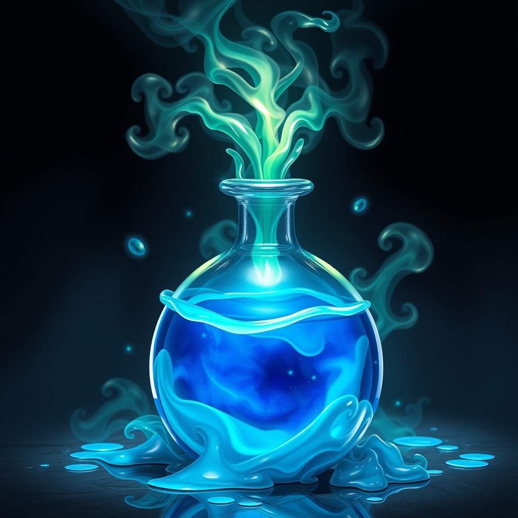 a potion full of blue magic goo, magic glow, toxic fumes, masterpiece, best quality, concept art