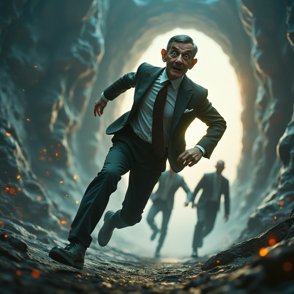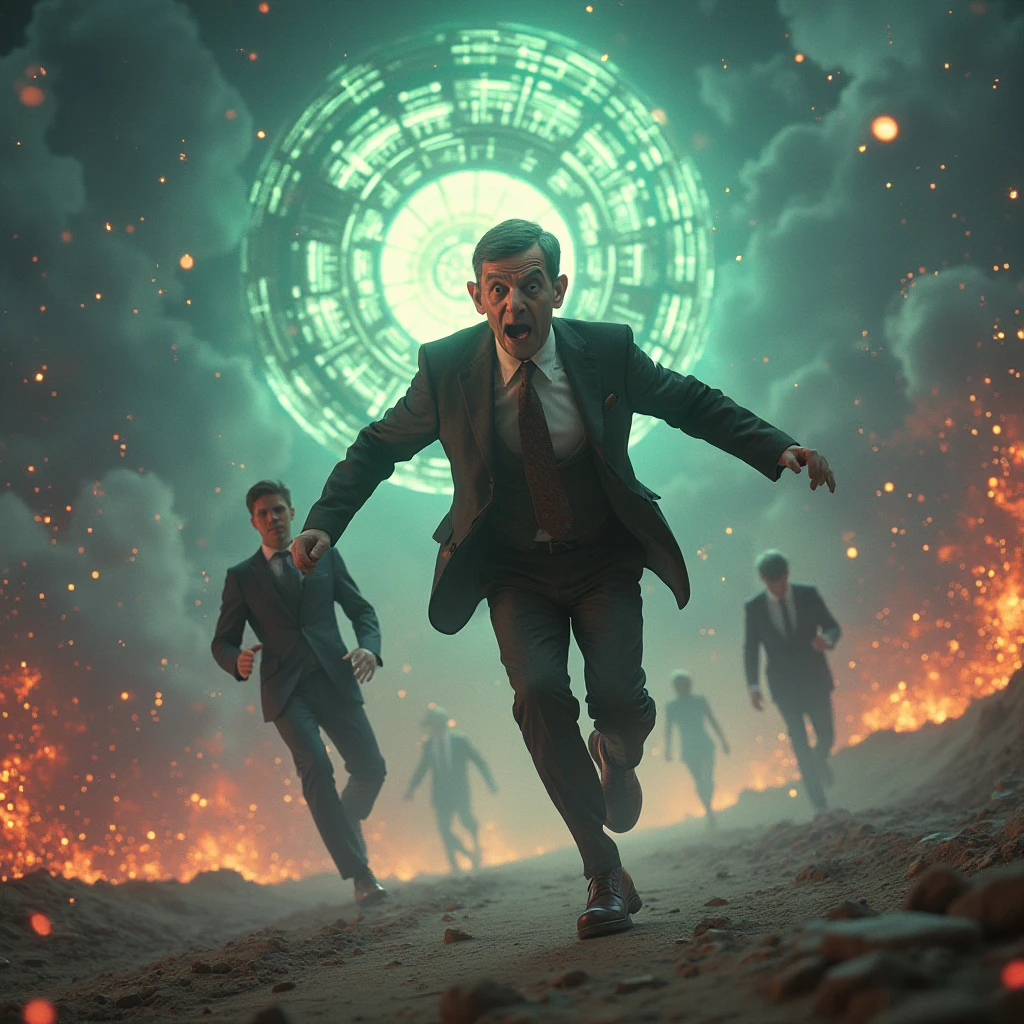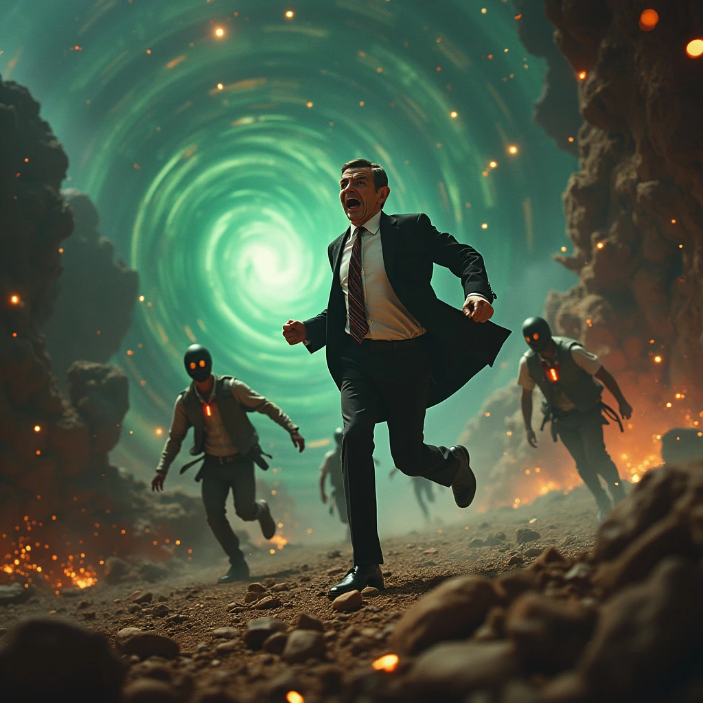 Mister Bean in a Cyberpunk suit with extradimensional beings chasing him, Mister Bean fleeing with a scared face, and the sky opening a bioluminescent portal, fantastic image, ultra realistic well detailed intricate masterpiece 16k rich and vibrant colors HDR effect perfect cinematic composition