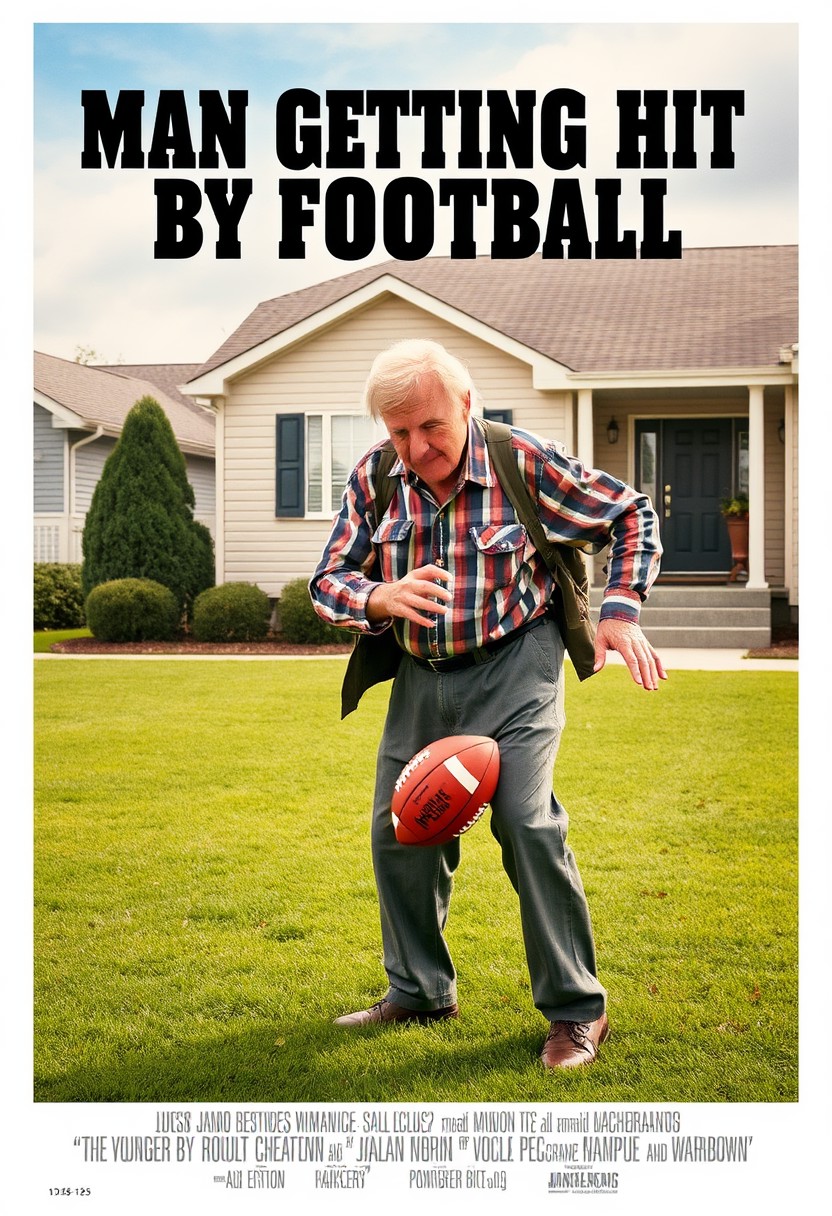 Movie poster, image of an old man standing on his front lawn getting hit in groin by American football Title "Man Getting Hit by Football"