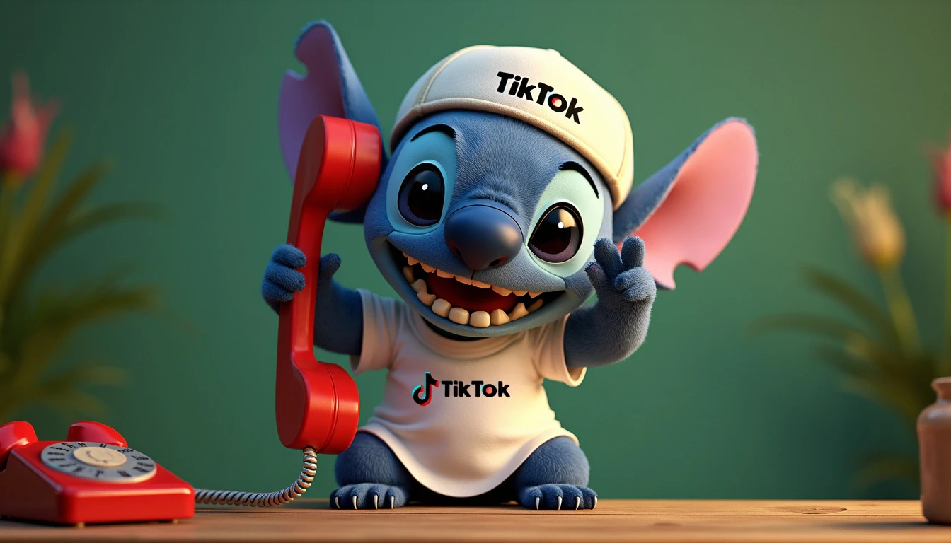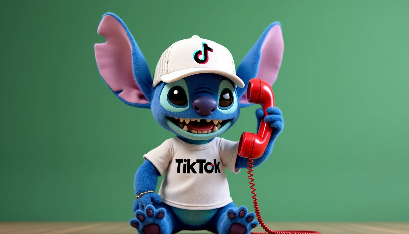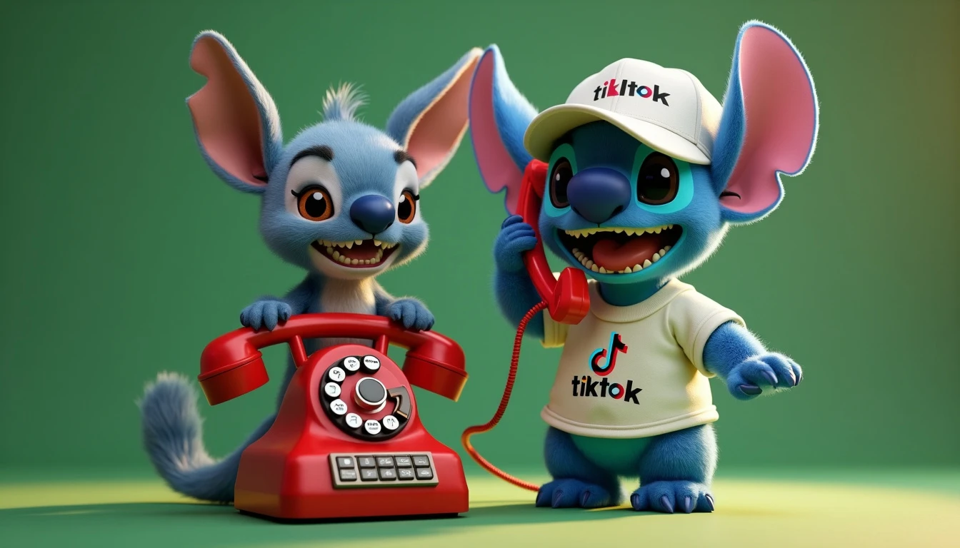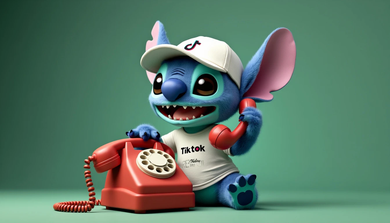 Fluffy 3d Stitch wearing a white t shirt Tiktok and Tiktok logo on it , white trucker hat ticktok logo , with Lilo, Stitch answering a red old telephone holding the handle up to his ears Greenscreen background