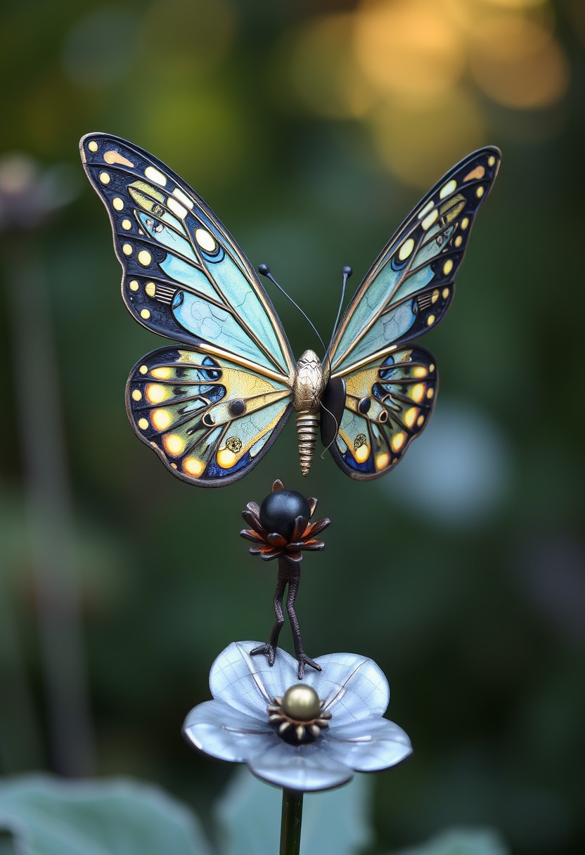steampunk butterfly standing on a metal flower